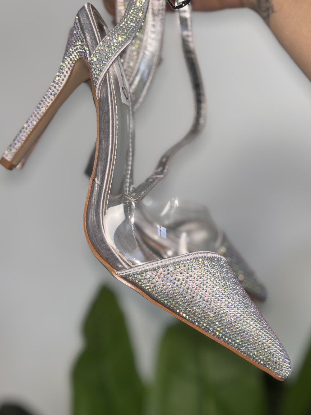 Decolletè con strass e base silver, chiusura con cinturino.