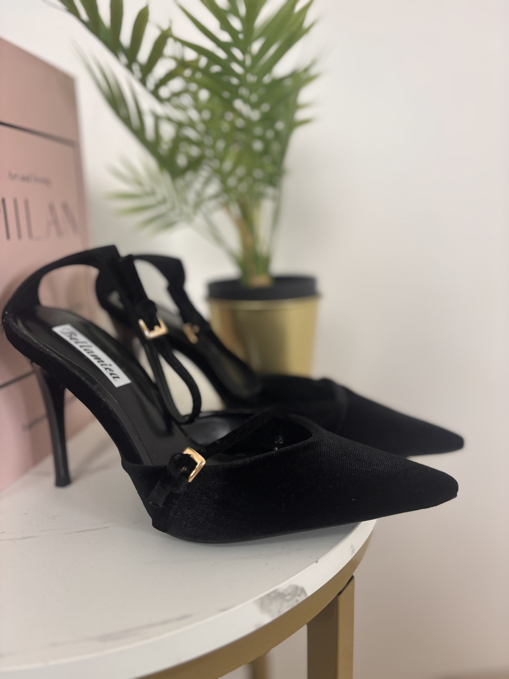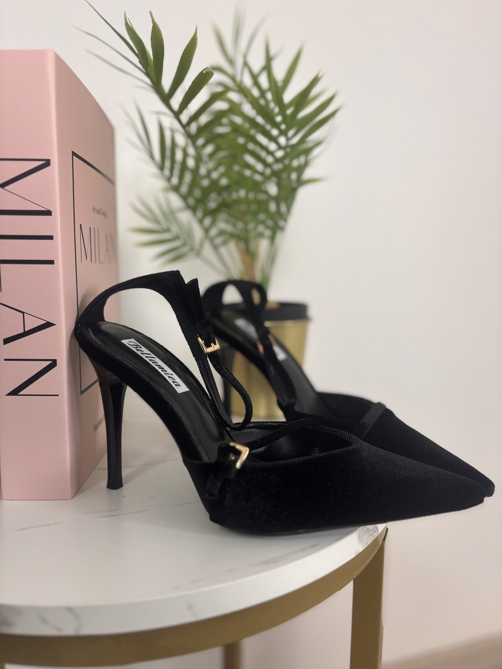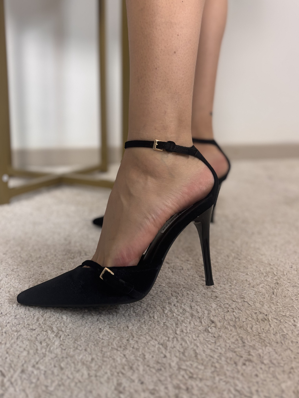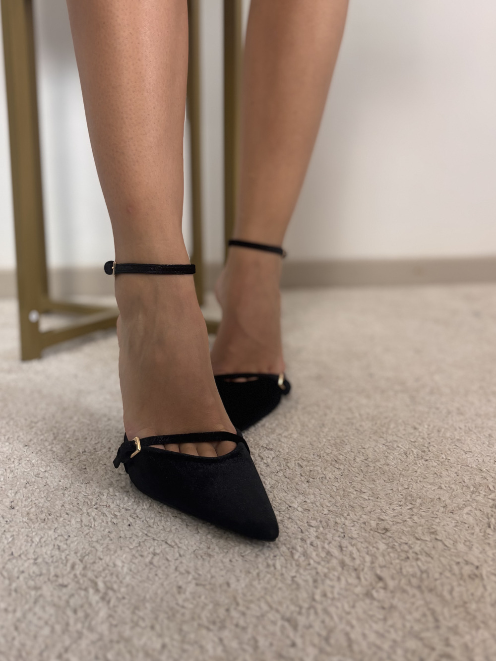 Decolletè in velluto con cinturino alla caviglia.
