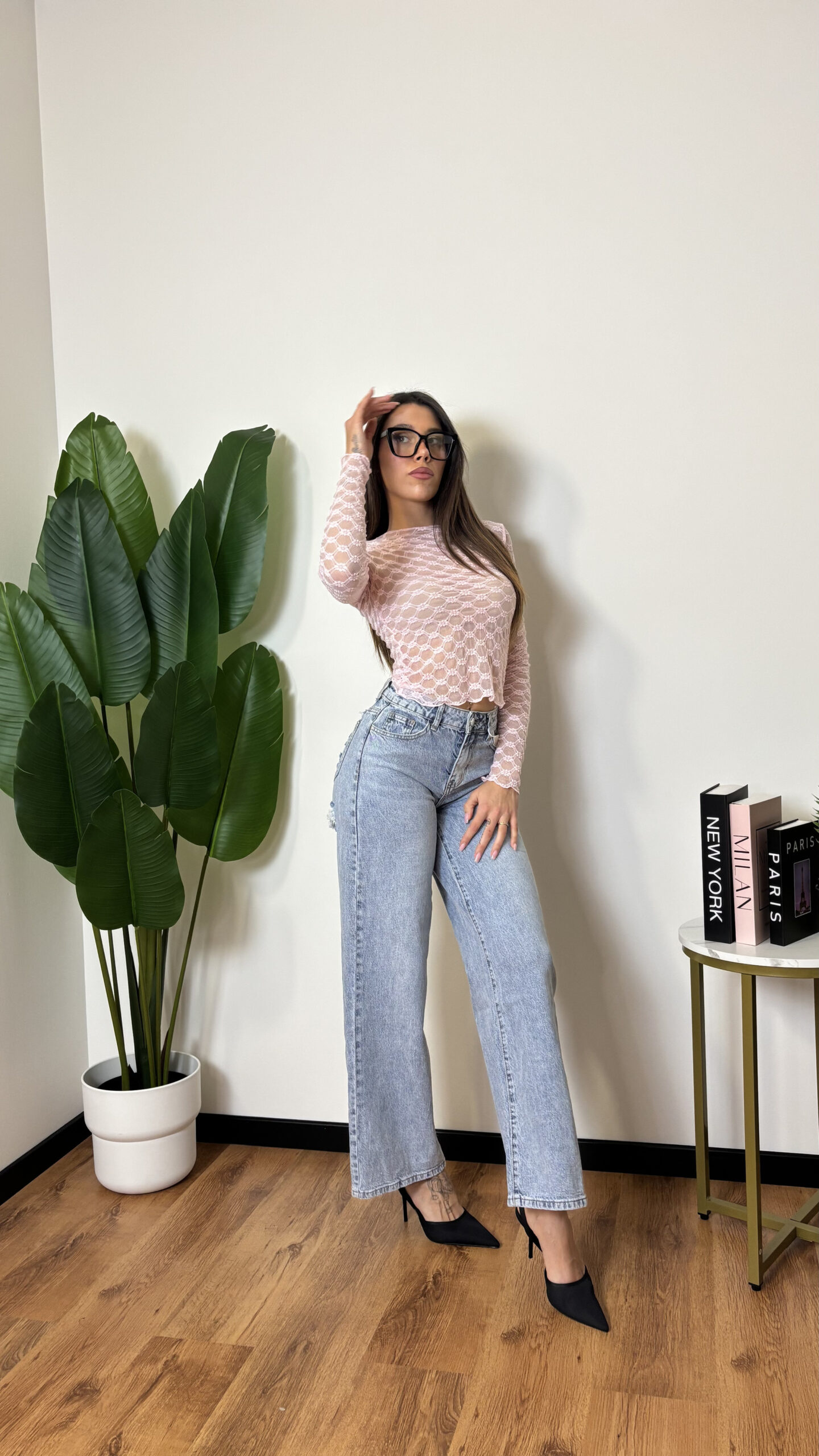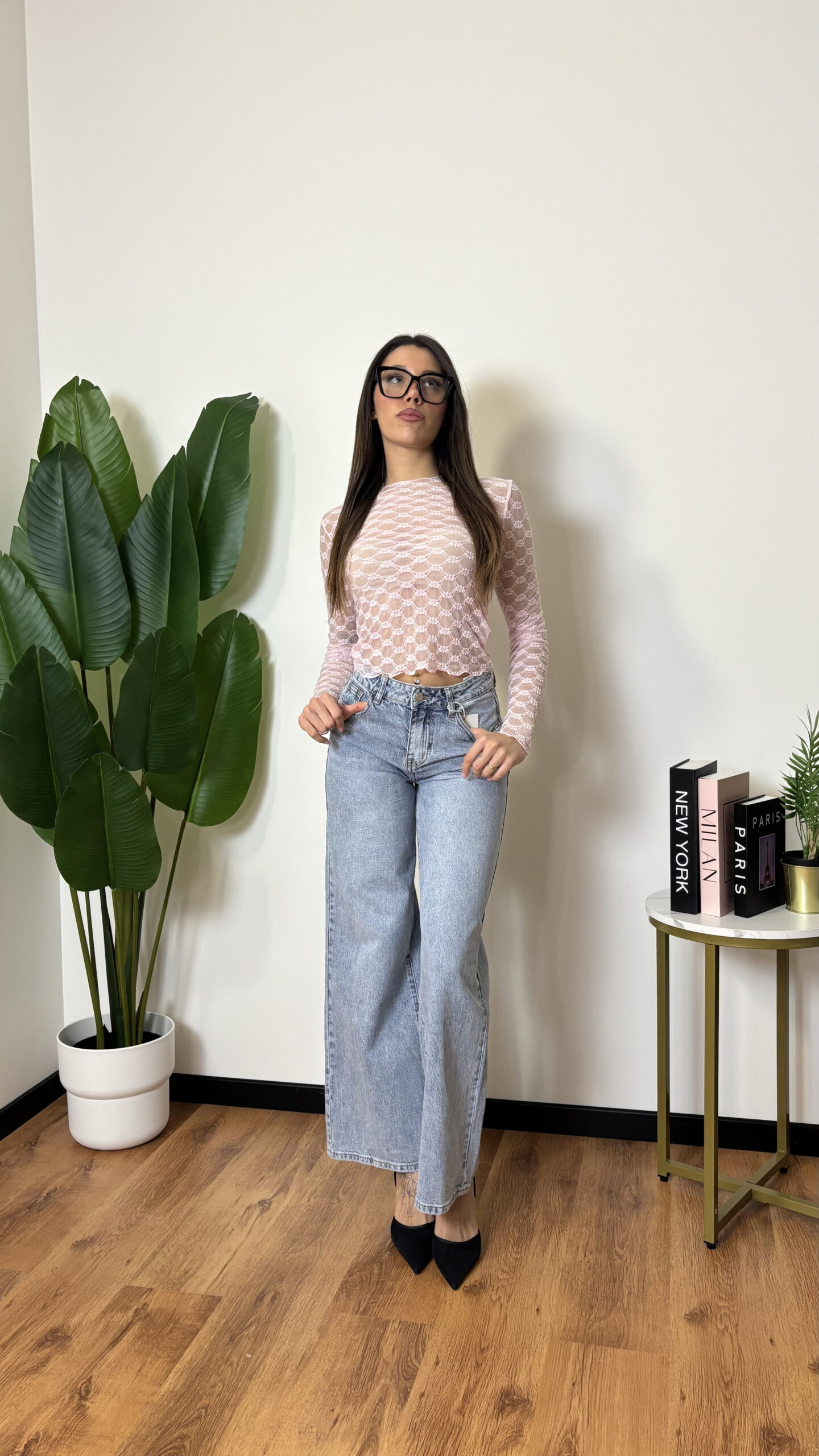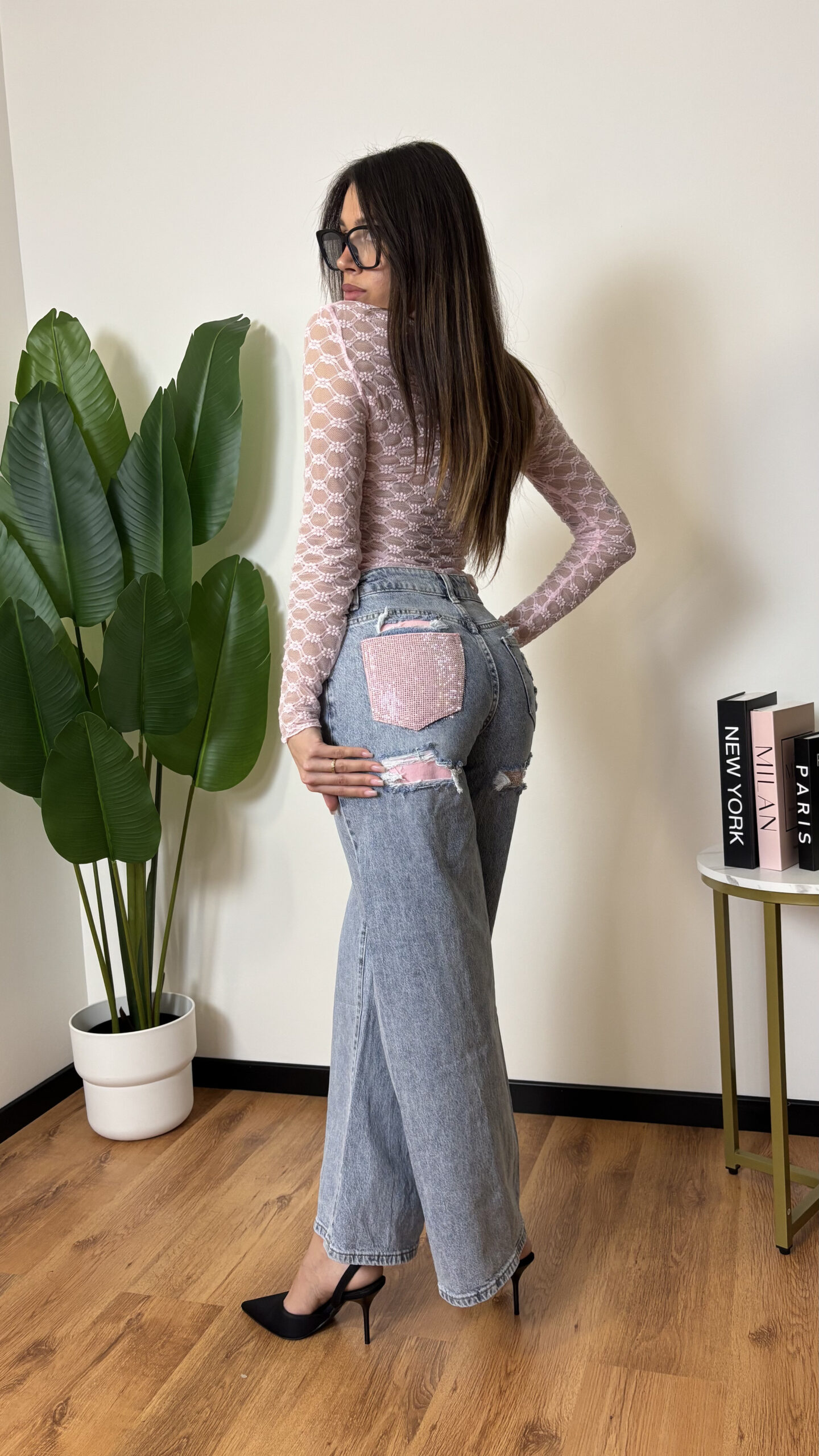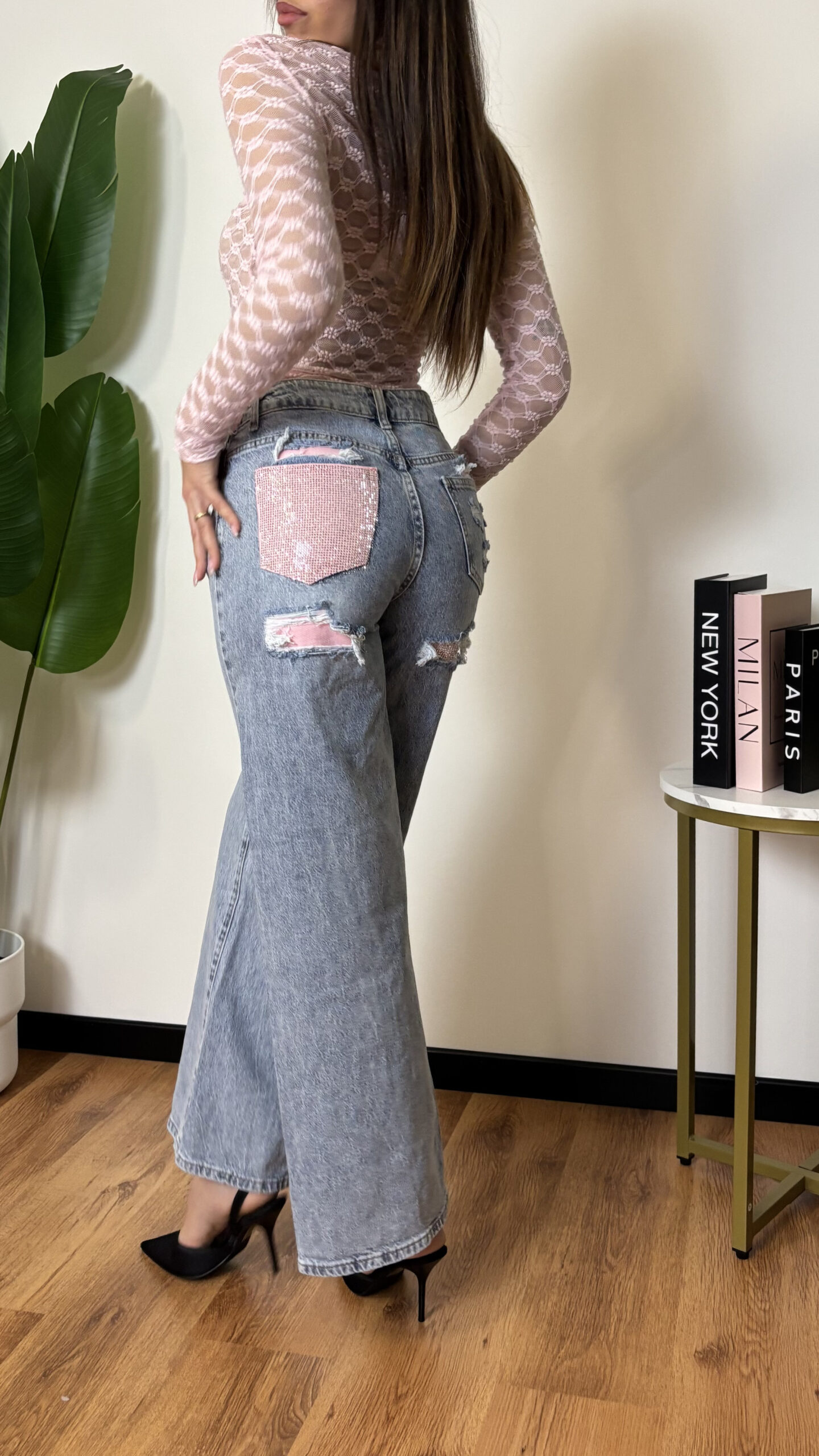 Jeans in denim chiaro con taschino full strass rosa e spacco sotto.