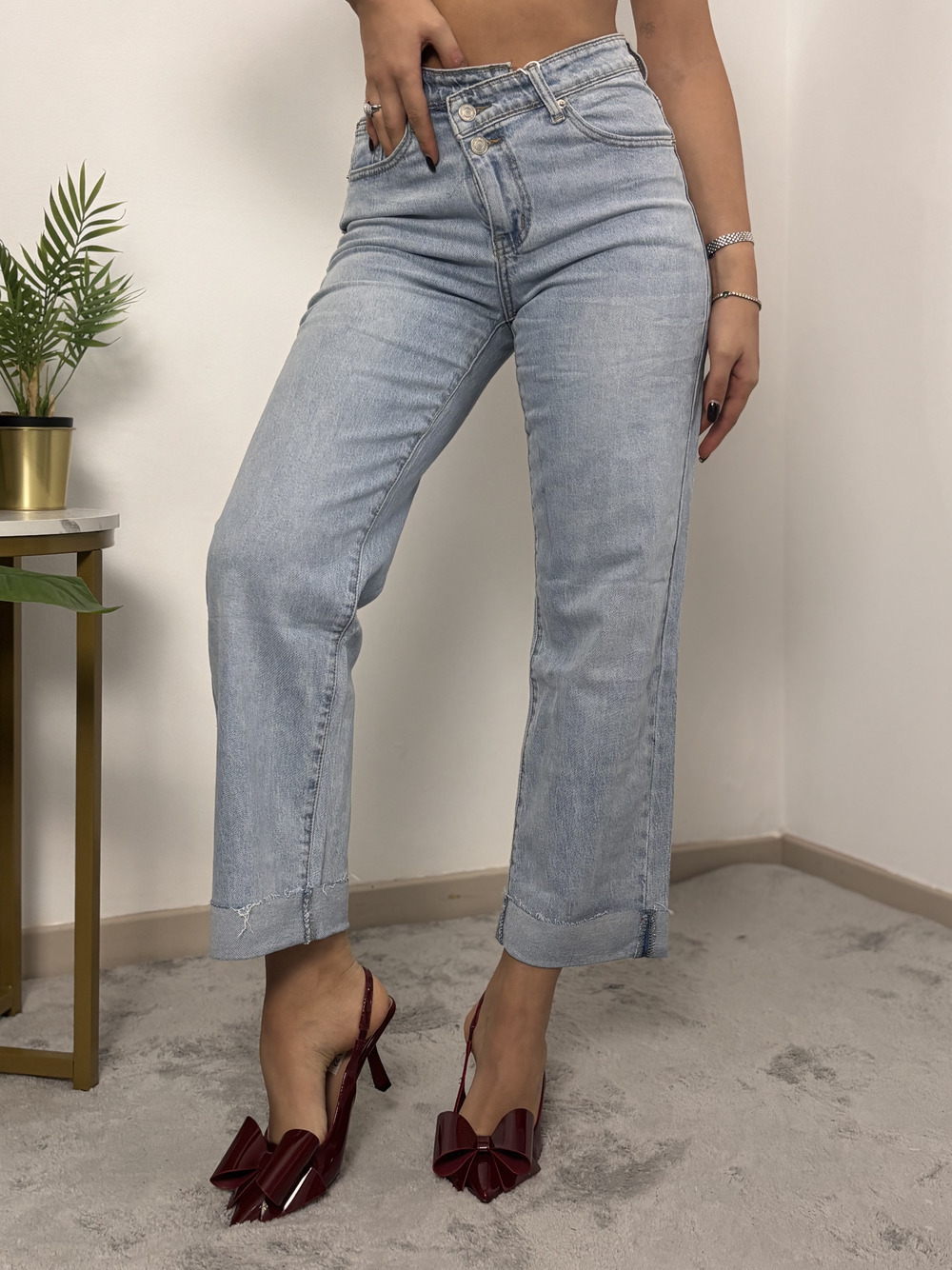 Jeans in denim chiaro, modello a palazzo corto con risvolto.