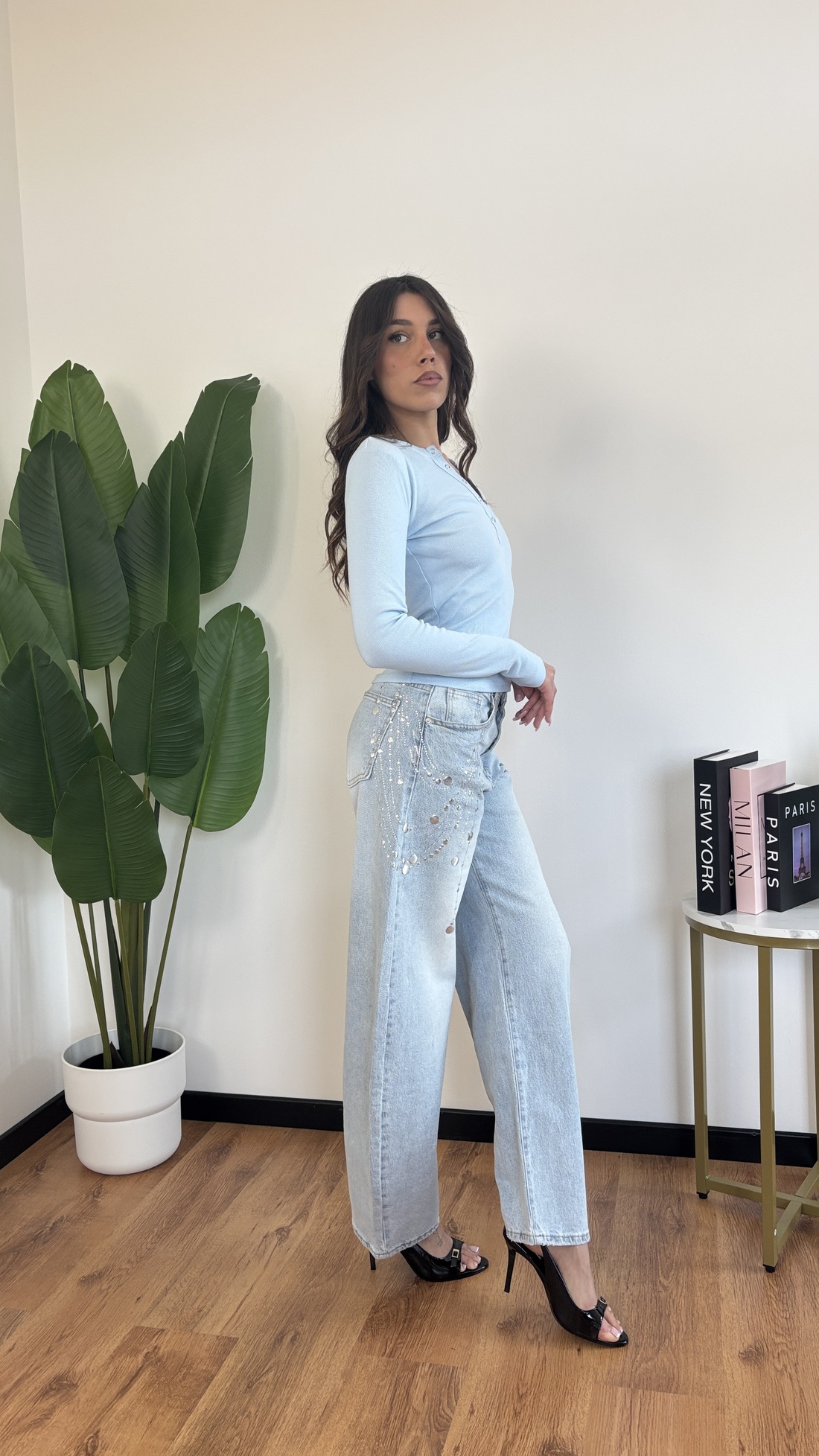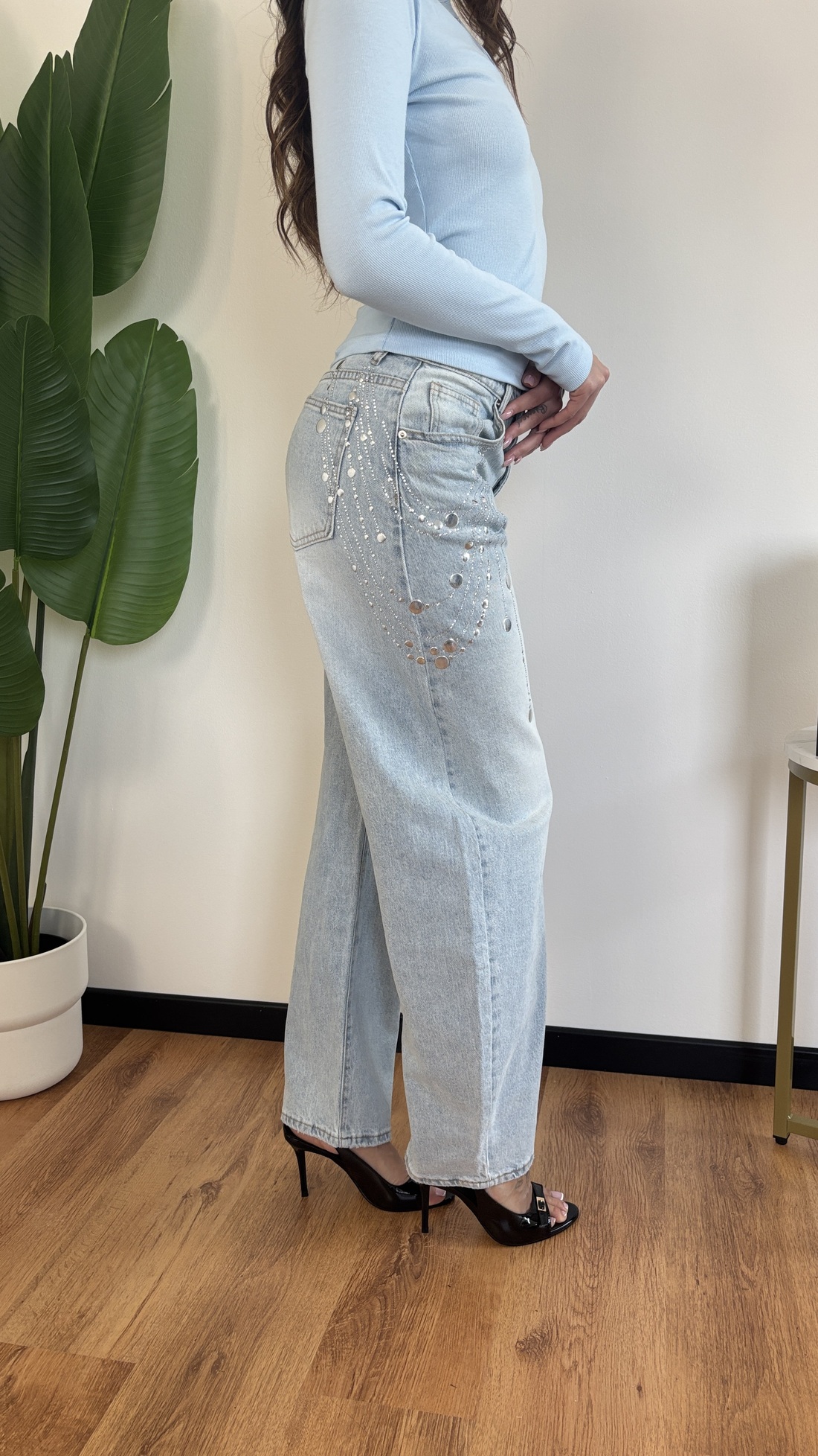 Jeans in denim chiaro con motivo silver in strass.
