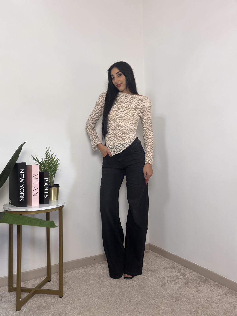 Jeans nero a palazzo, modello elasticizzato.