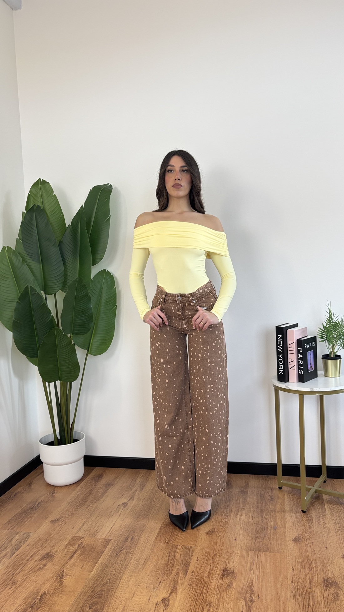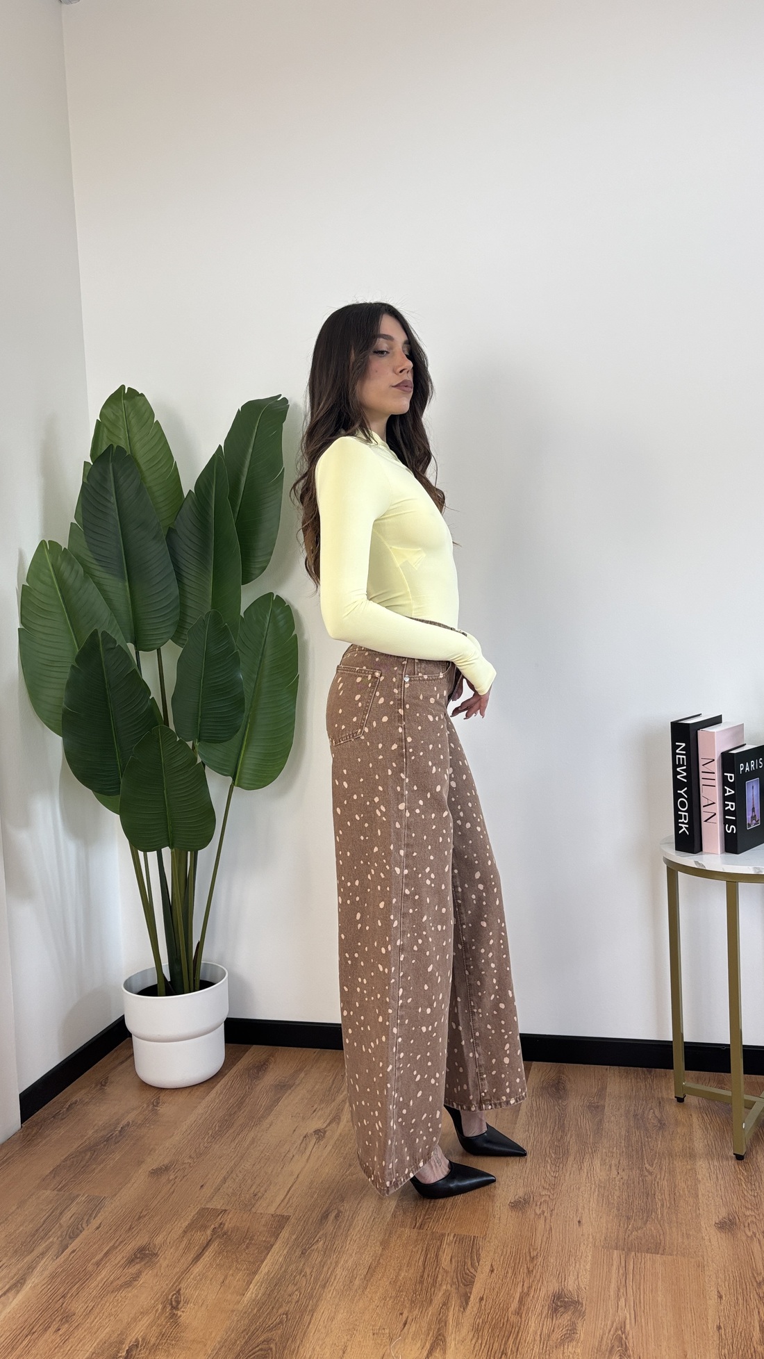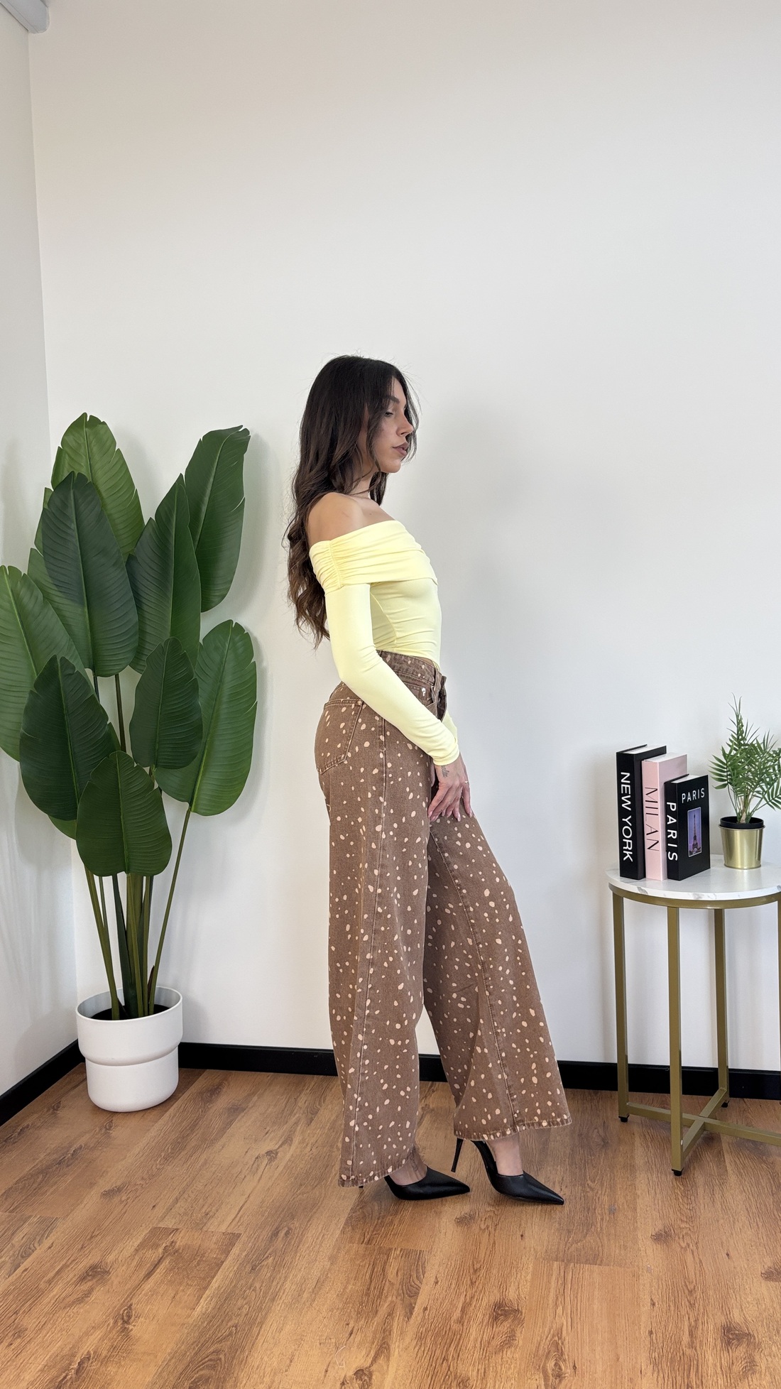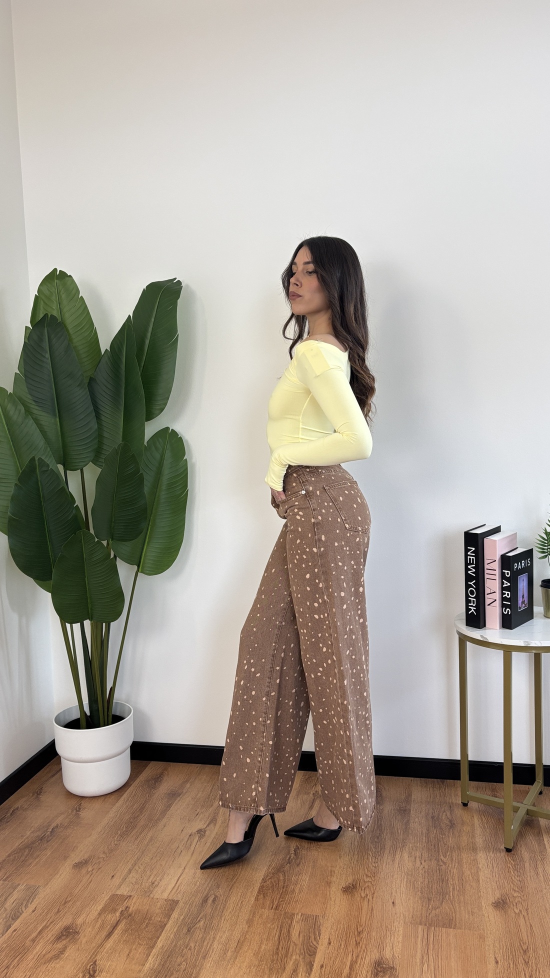 Jeans a palazzo con pois chiari e base in denim marrone.