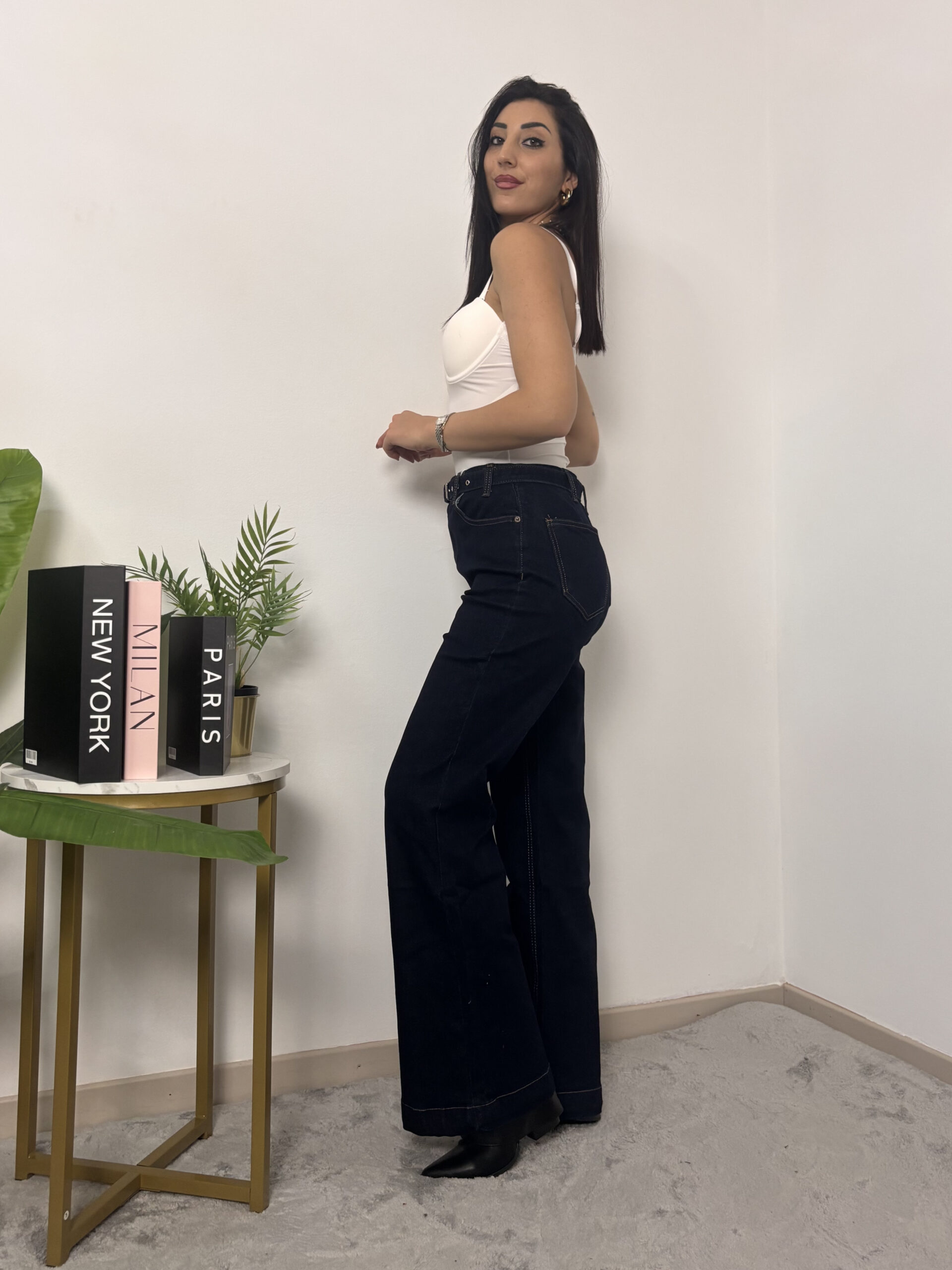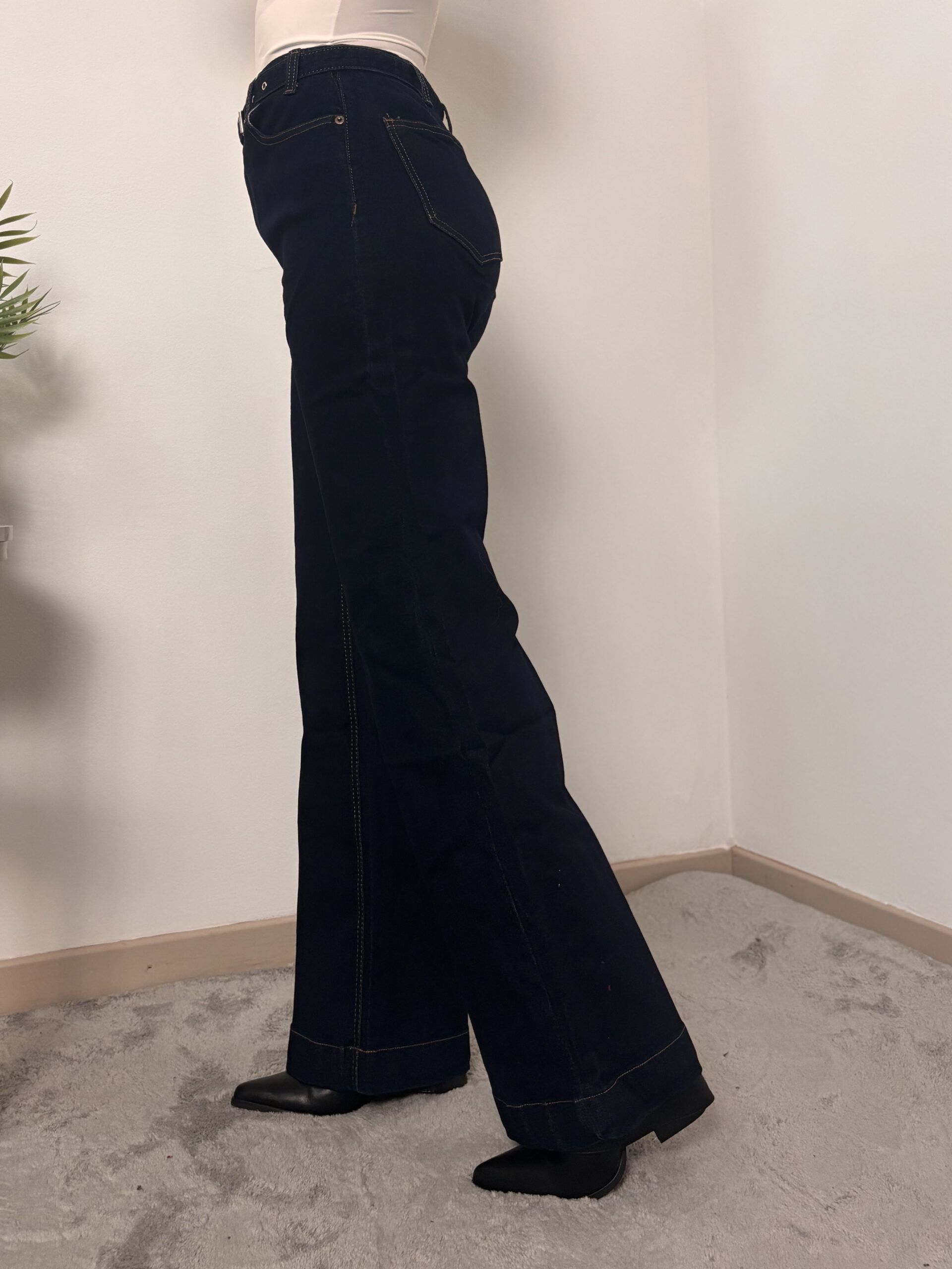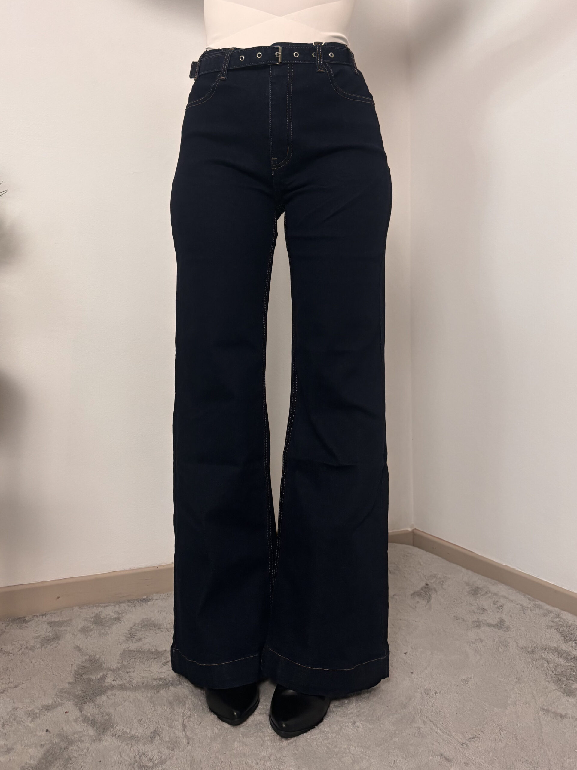 Jeans a vita alta con cintura in vita a zampa, denim scuro.