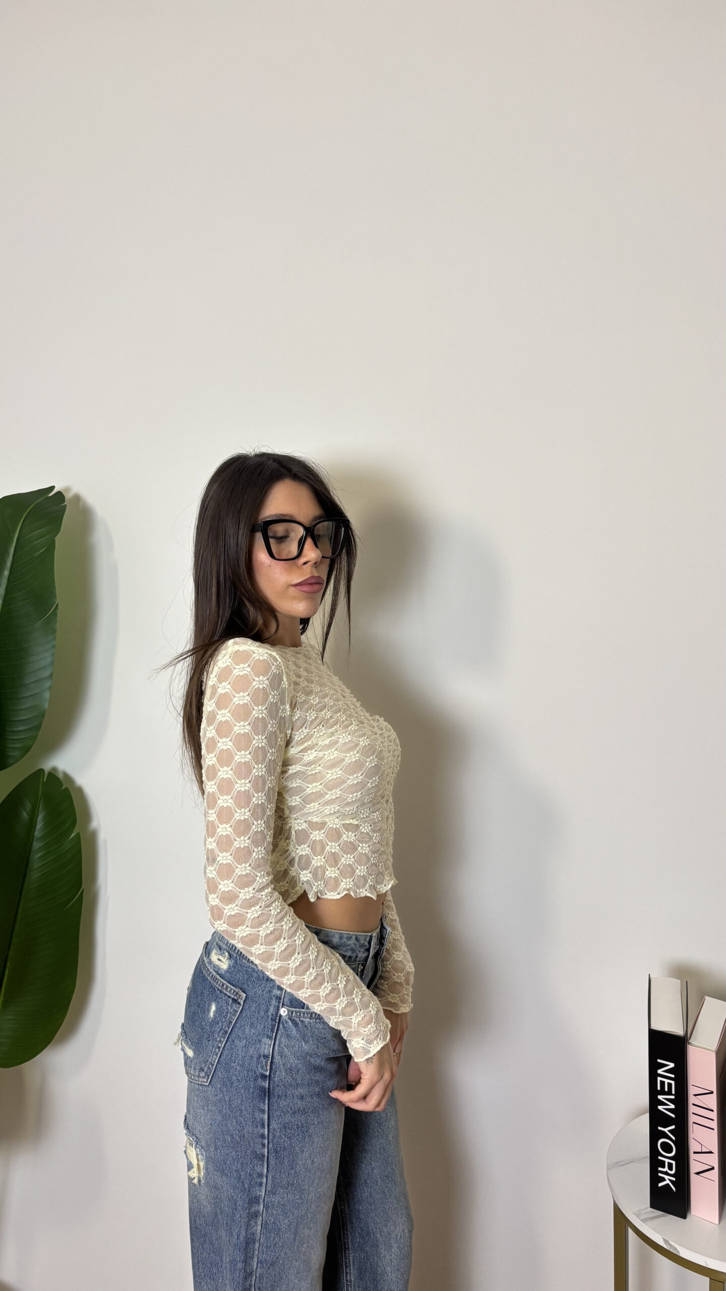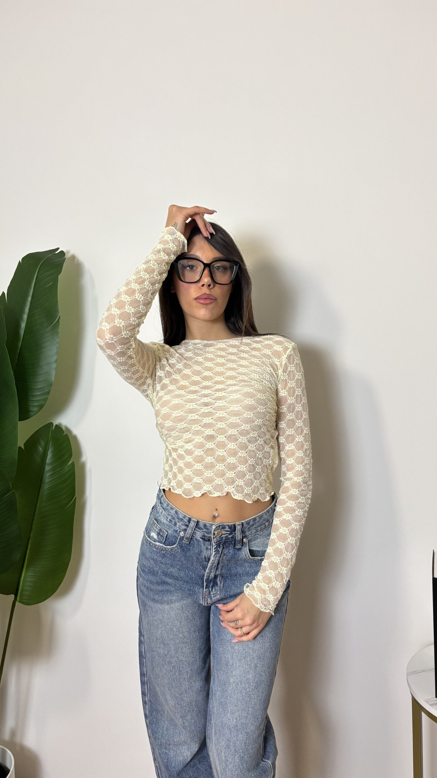 Maglia in pizzo leggermente trasparente, elasticizzata.