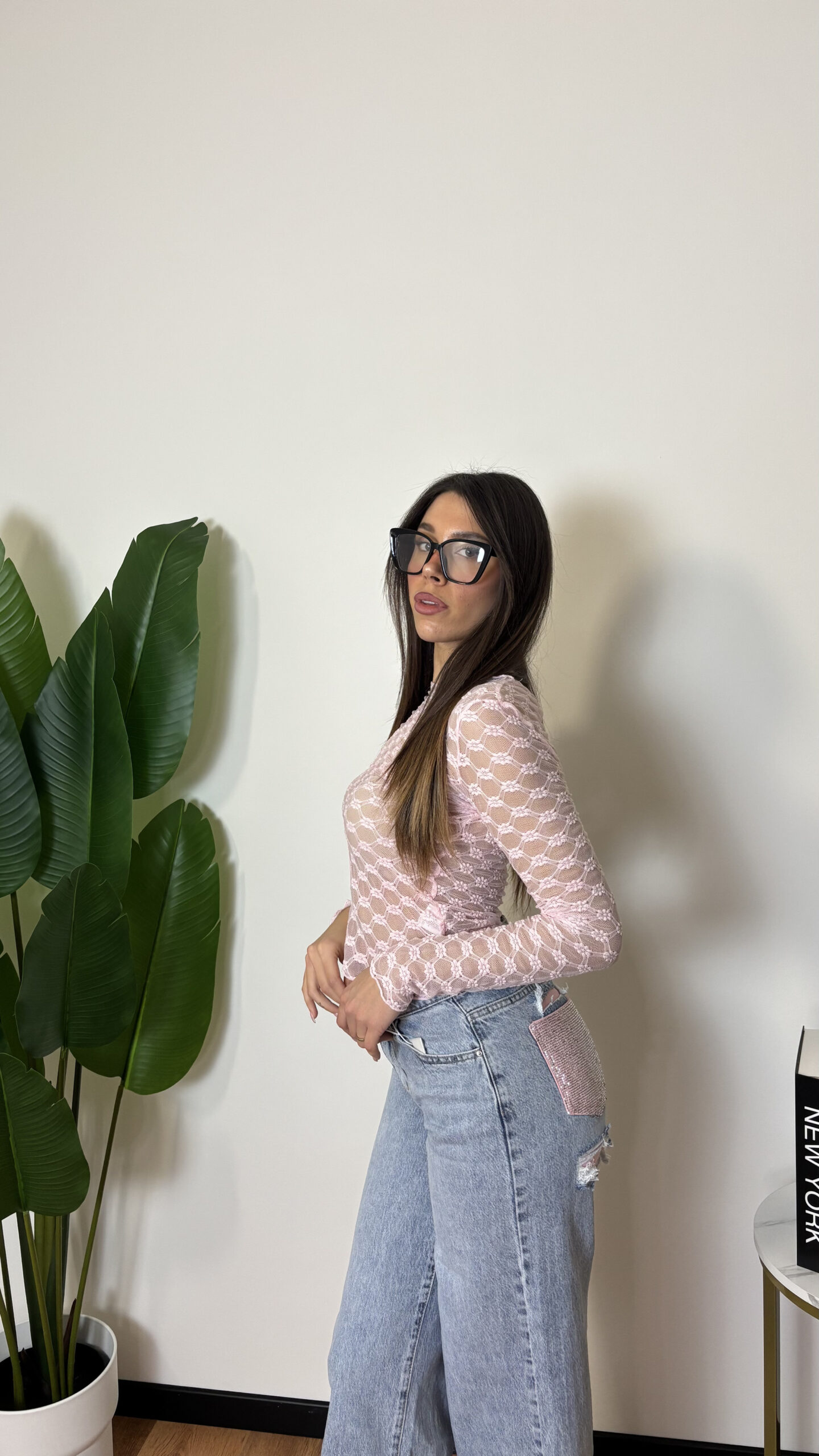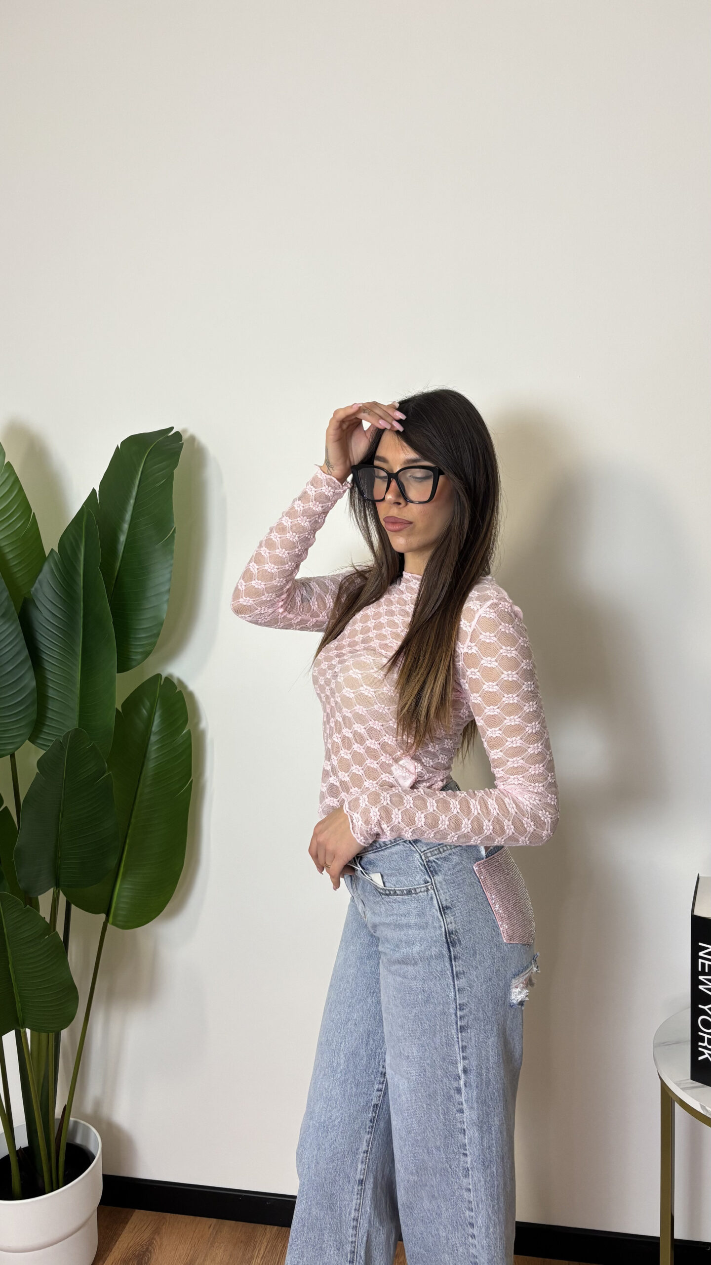 Maglia in pizzo leggermente trasparente, elasticizzata.