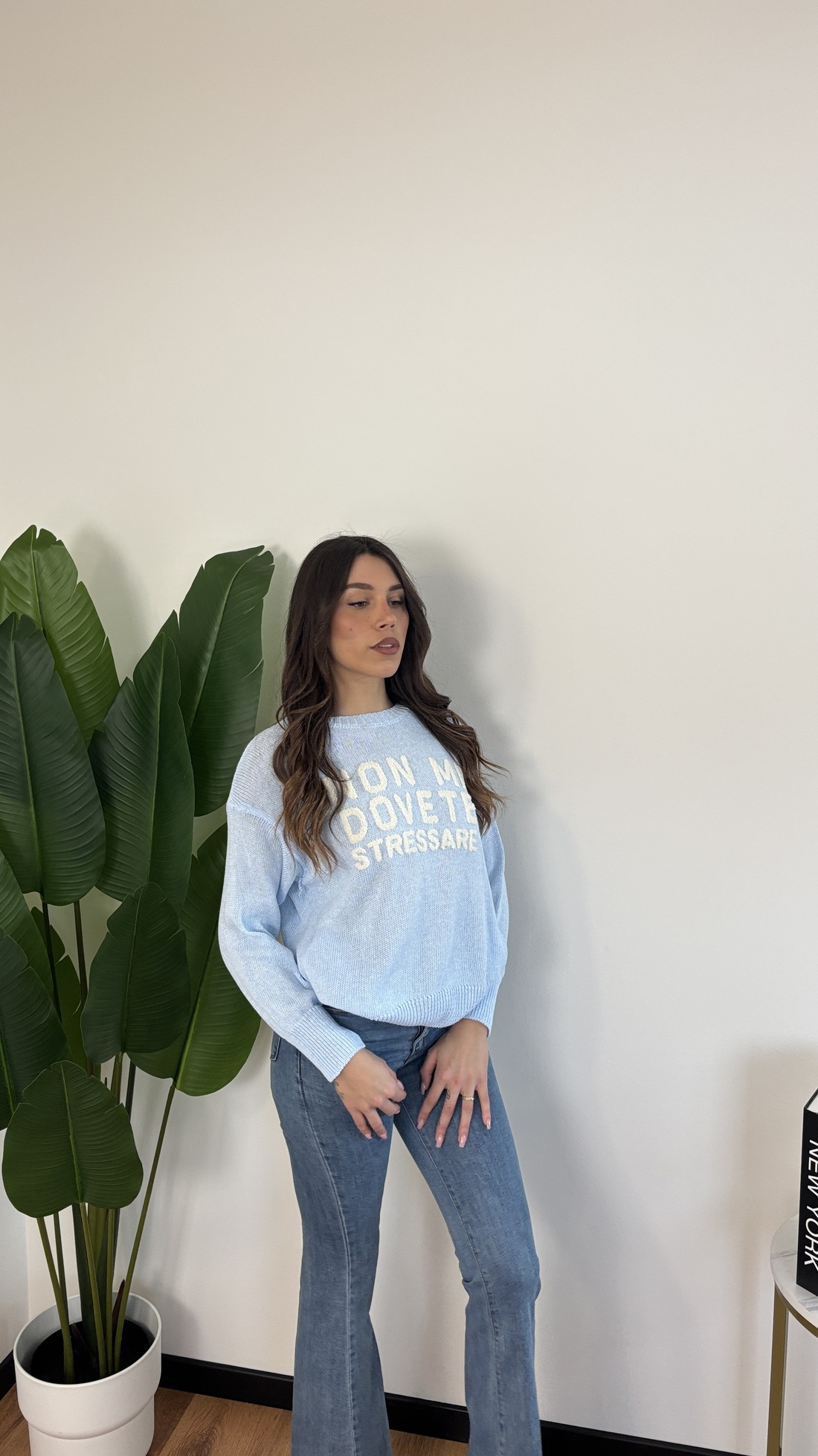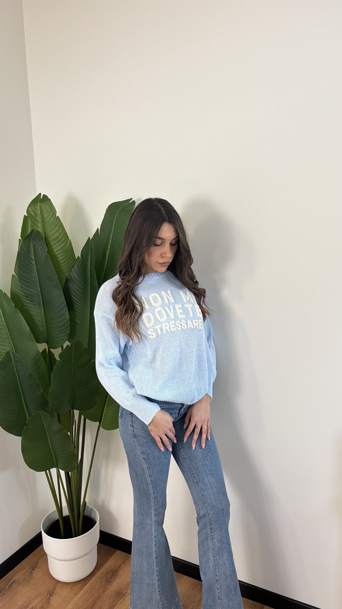 Maglione in filo con scritta “Non mi dovete stressare”.