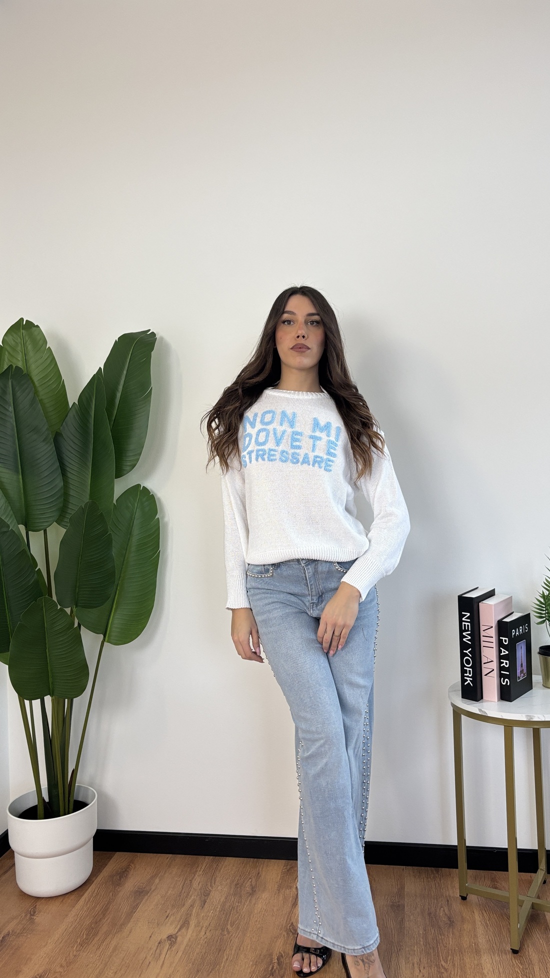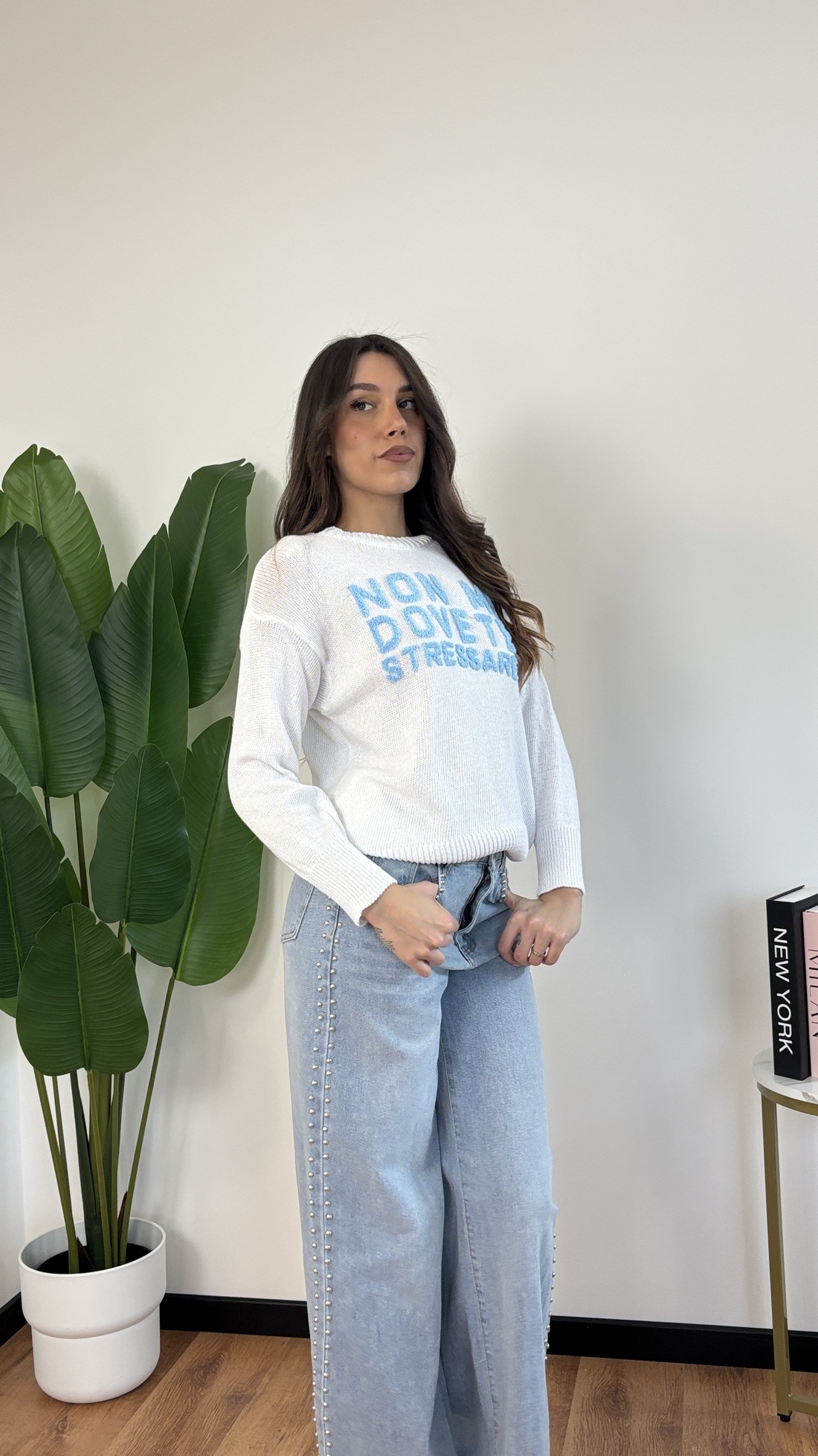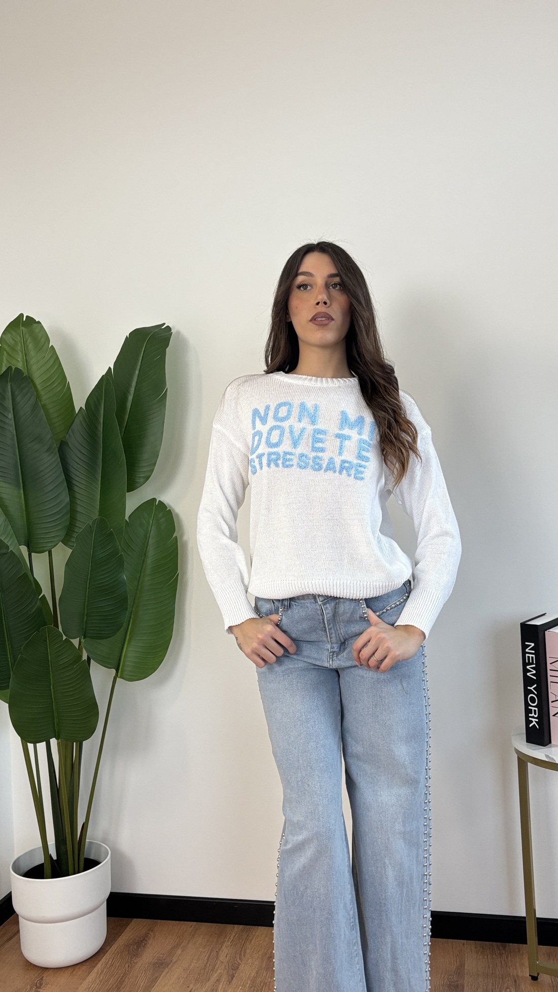 Maglione in filo con scritta “Non mi dovete stressare”.