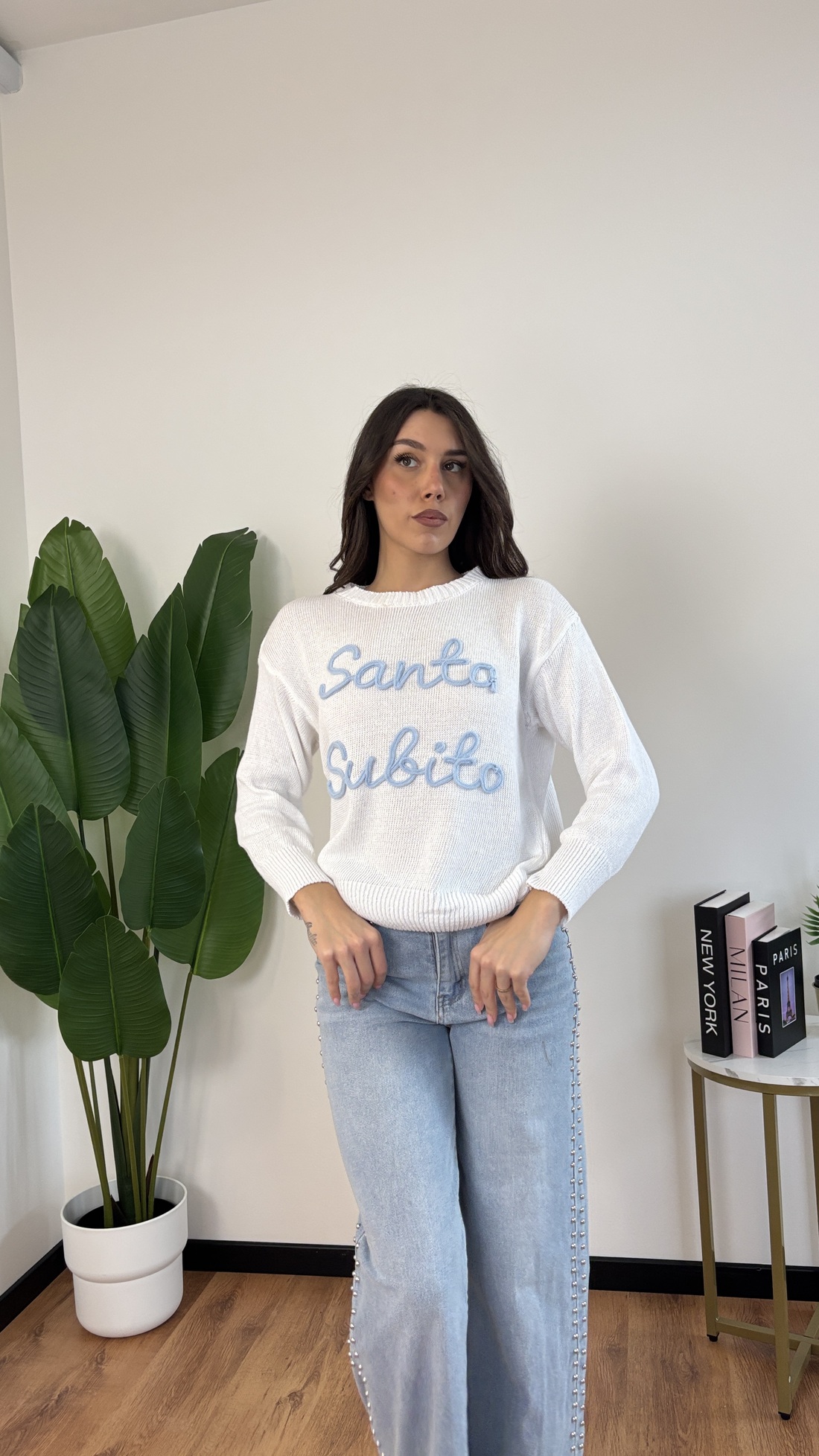 Maglione in filo con scritta “Santa subito”.