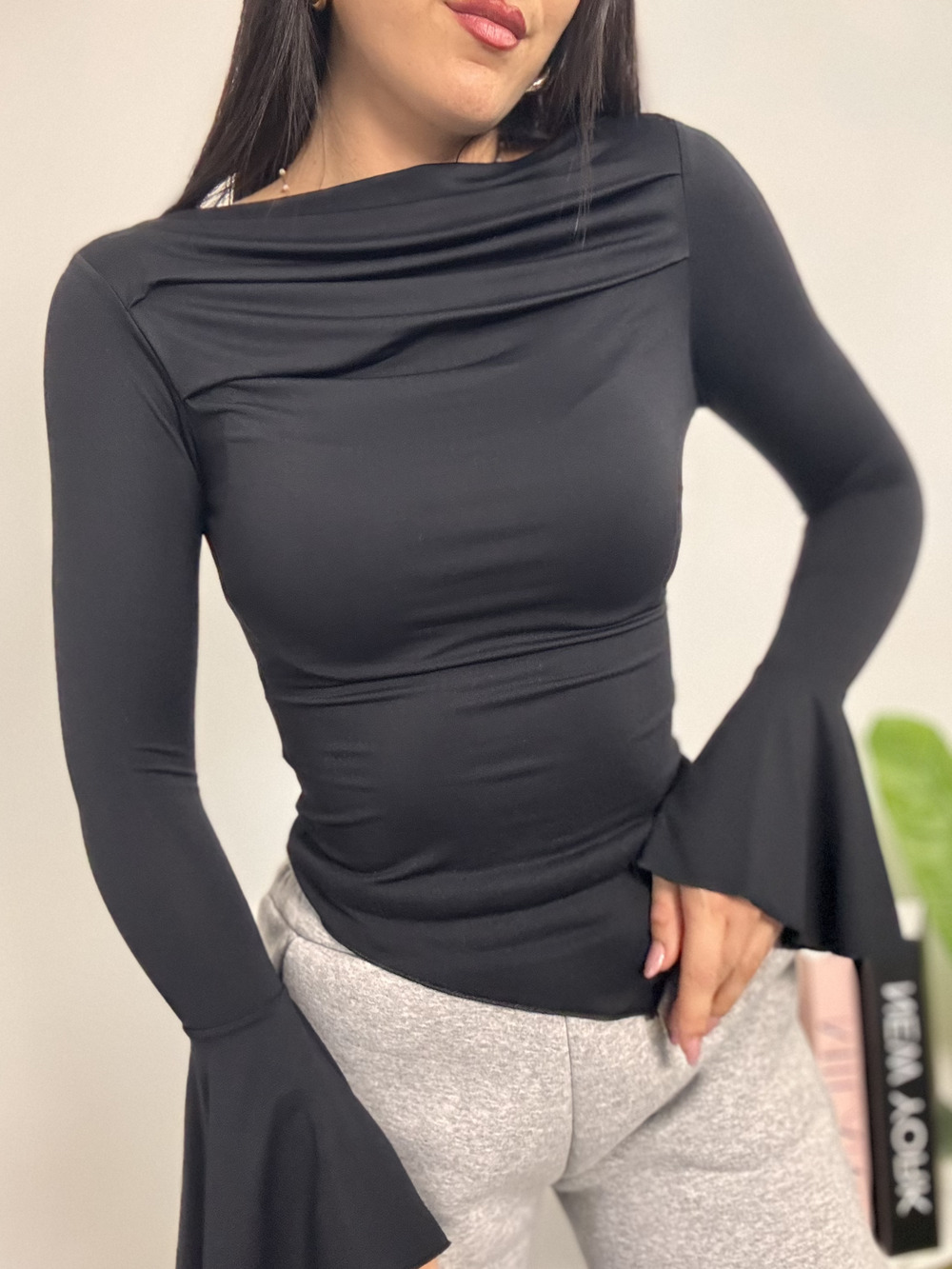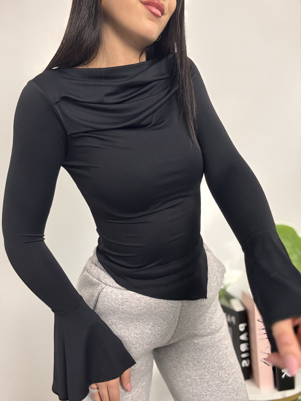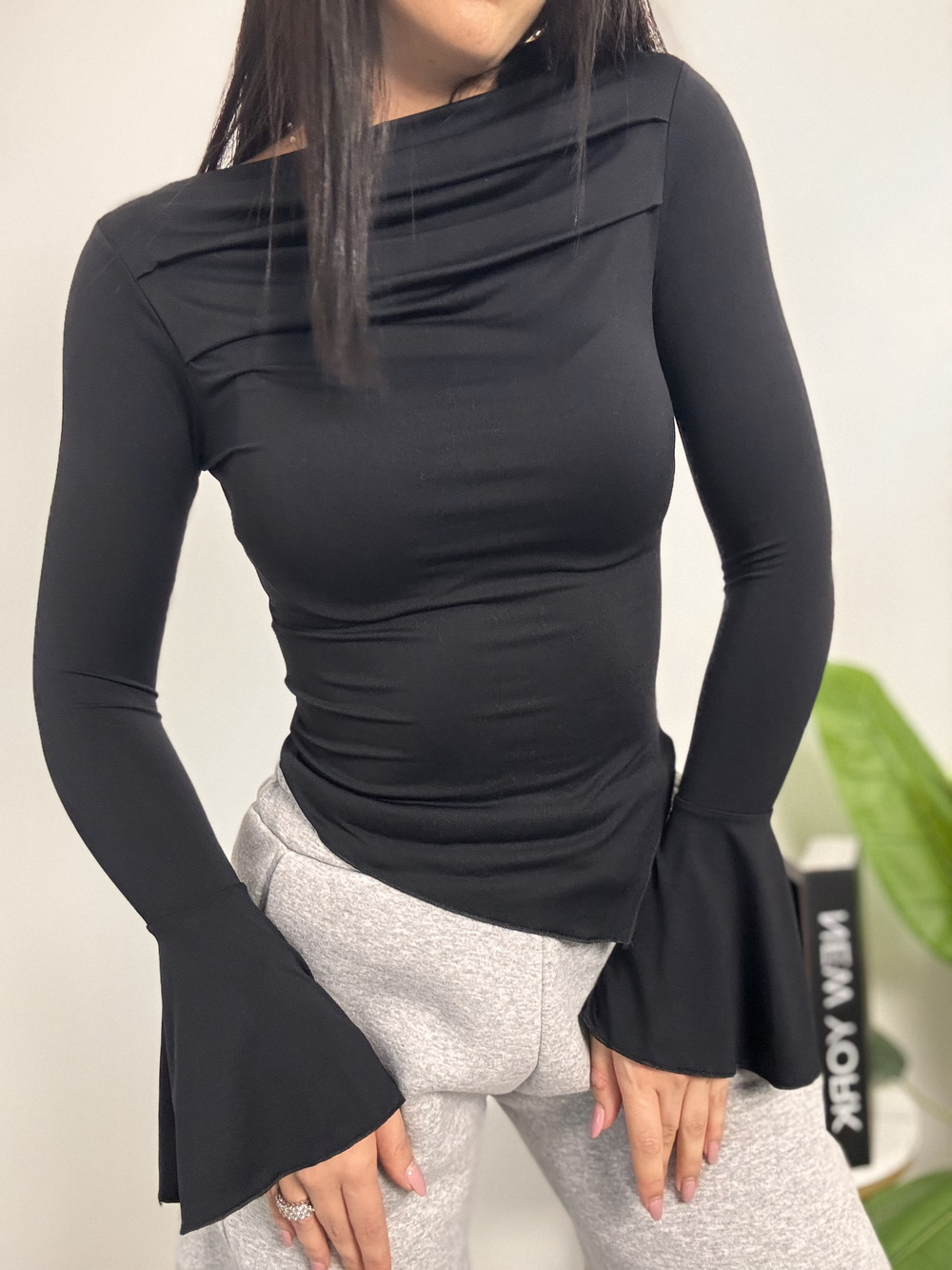 Maglia in lycra con scollo obliquo e maniche a campana.