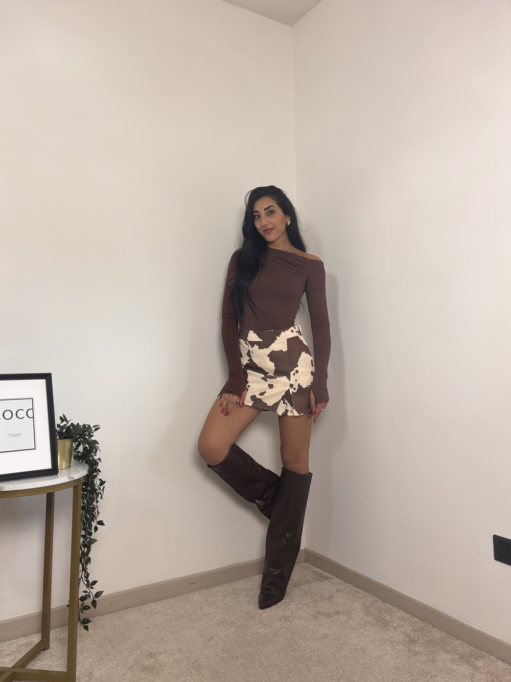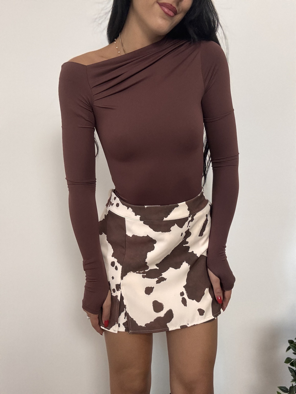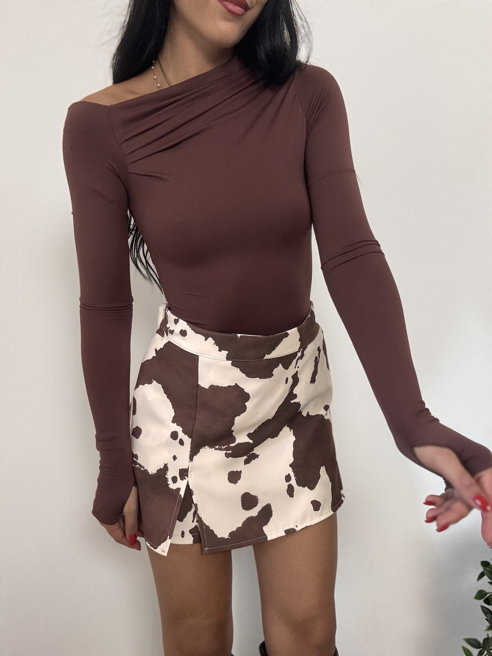 Mini gonna a pantaloncino con stampa muccata panna e marrone.