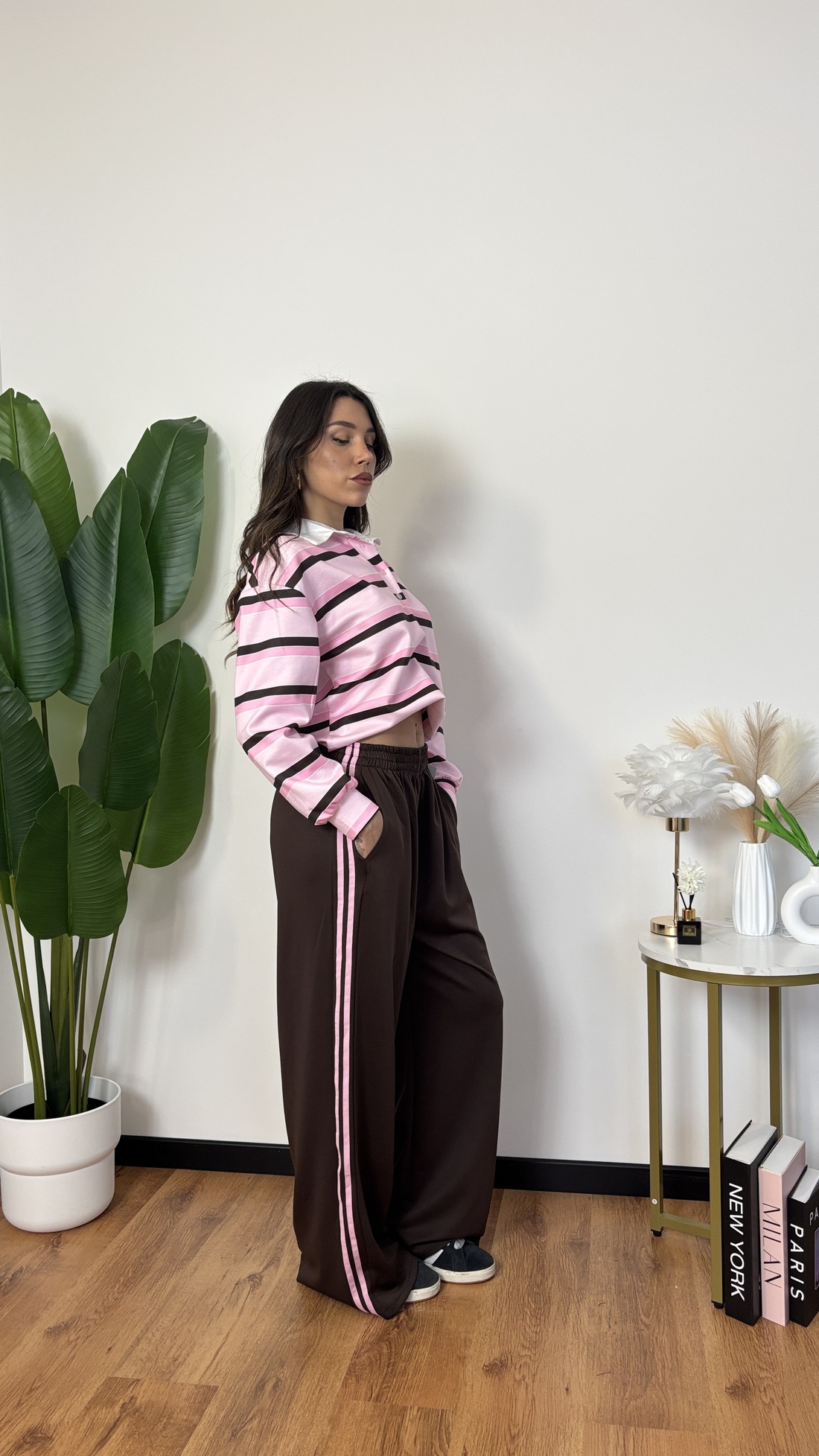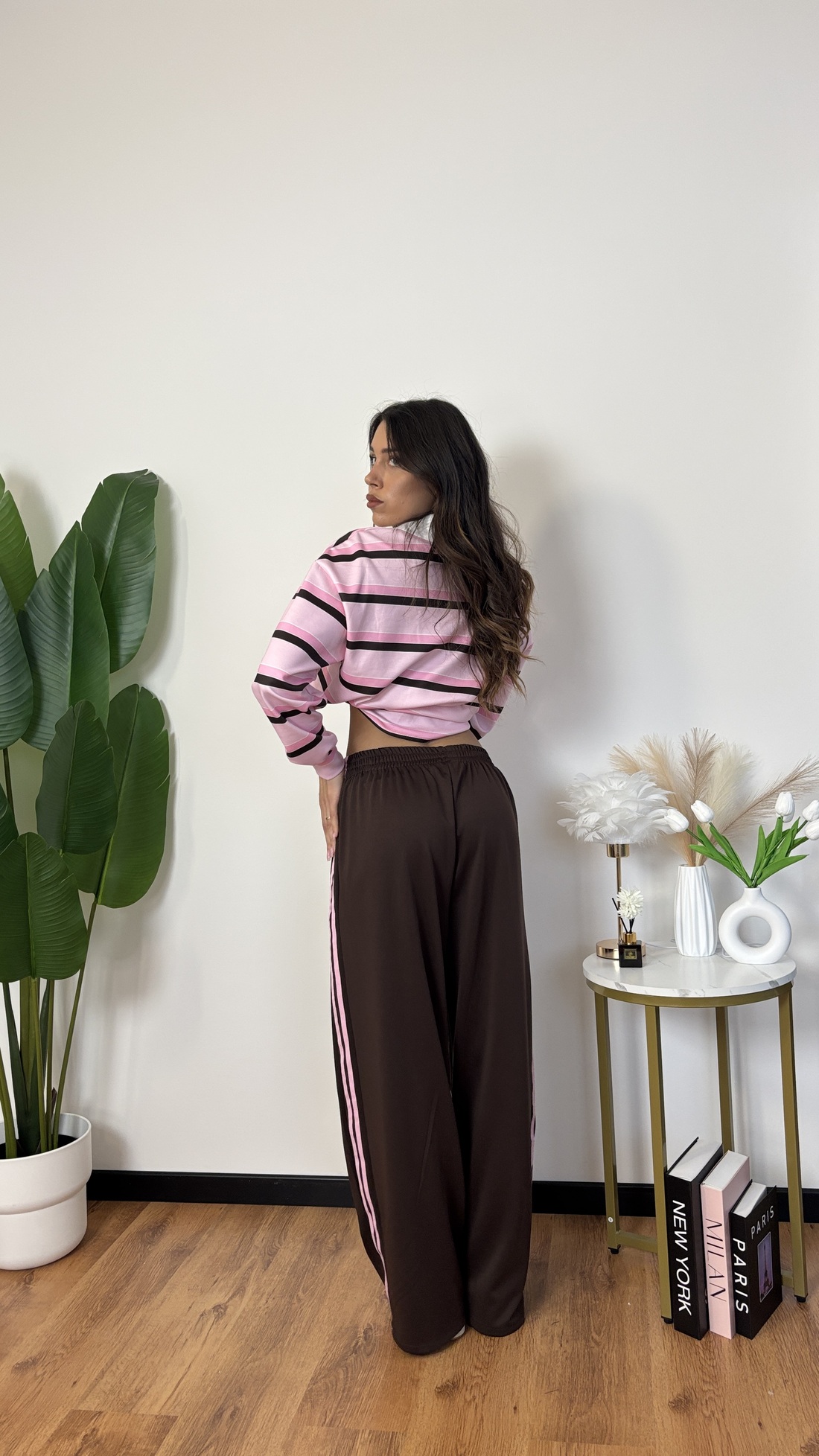 Elastico in vita, pantalone a palazzo.