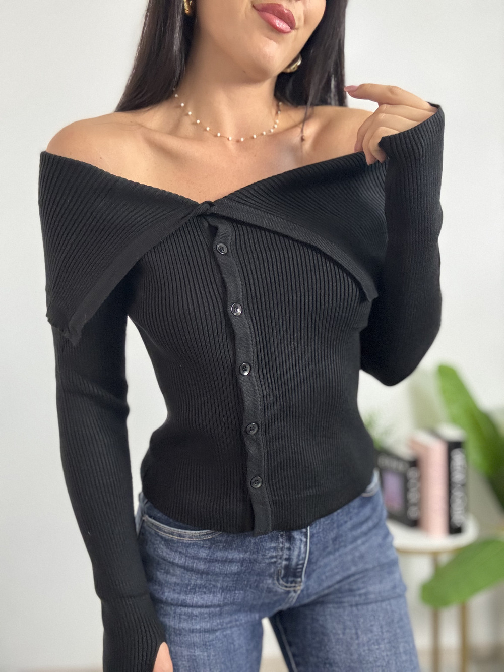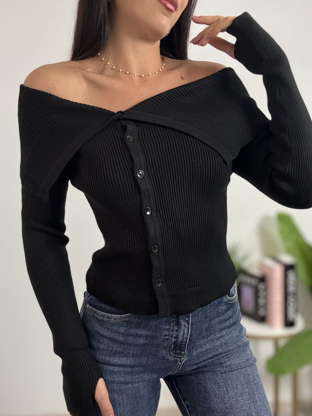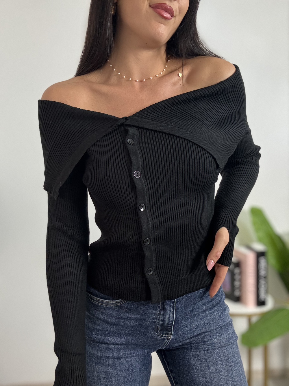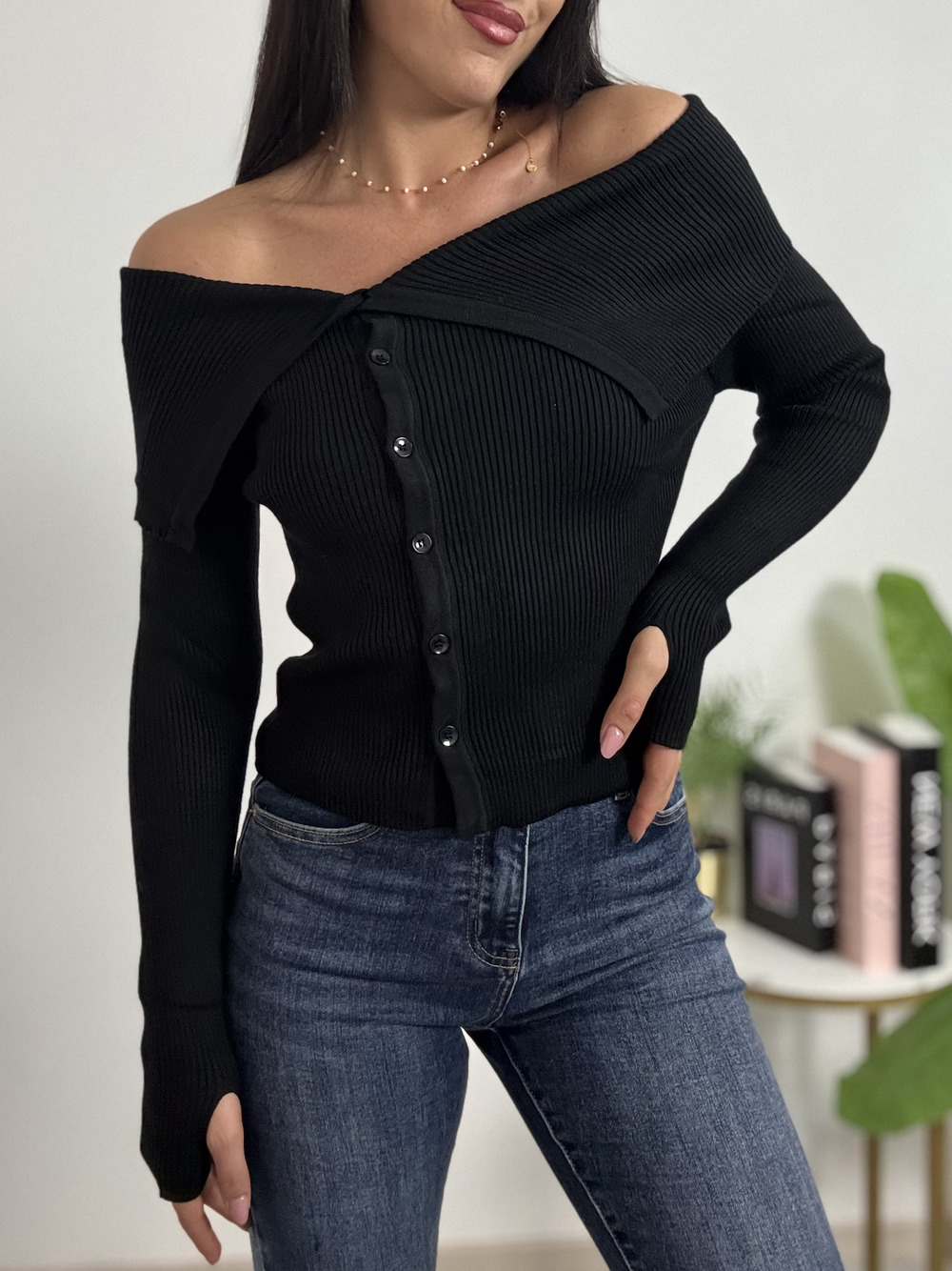 Maglia a costine con bottoncini laterali, collo ampio a fascia.