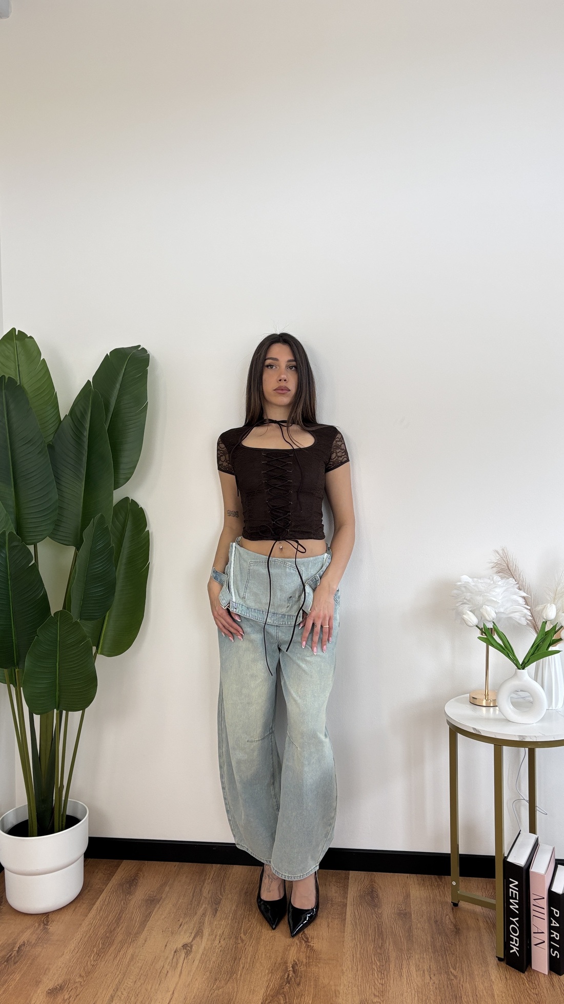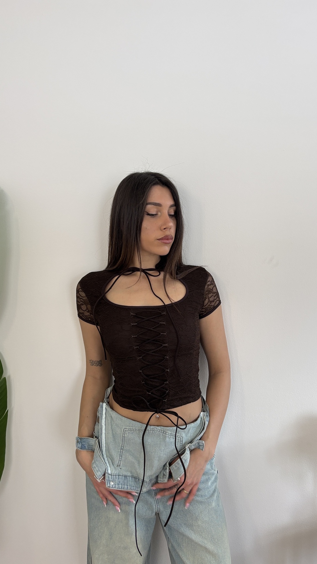 T-shirt in pizzo con laccetti davanti.