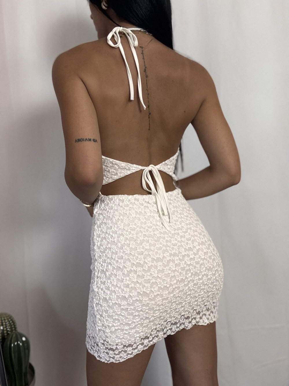 Tubino in pizzo bianco corto, modello con schiena scoperta.