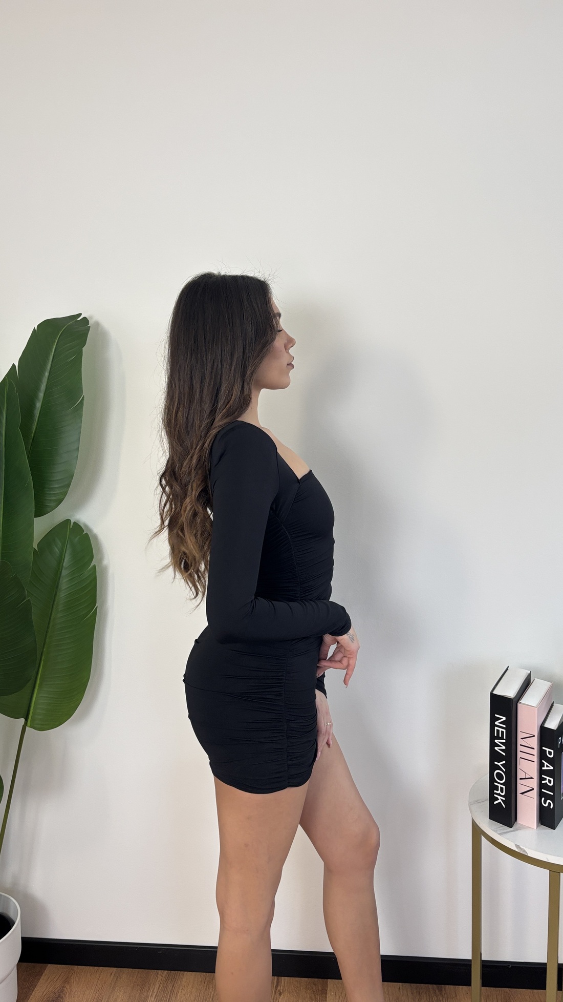 Tubino nero in lycra con scollo quadrato e arricciature laterali.