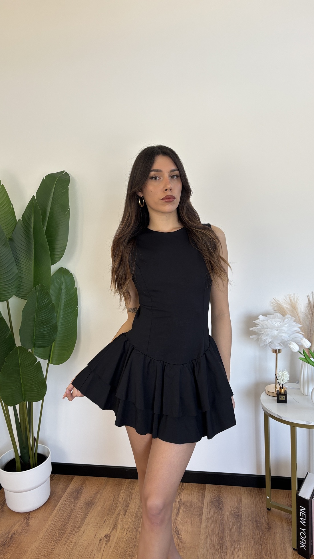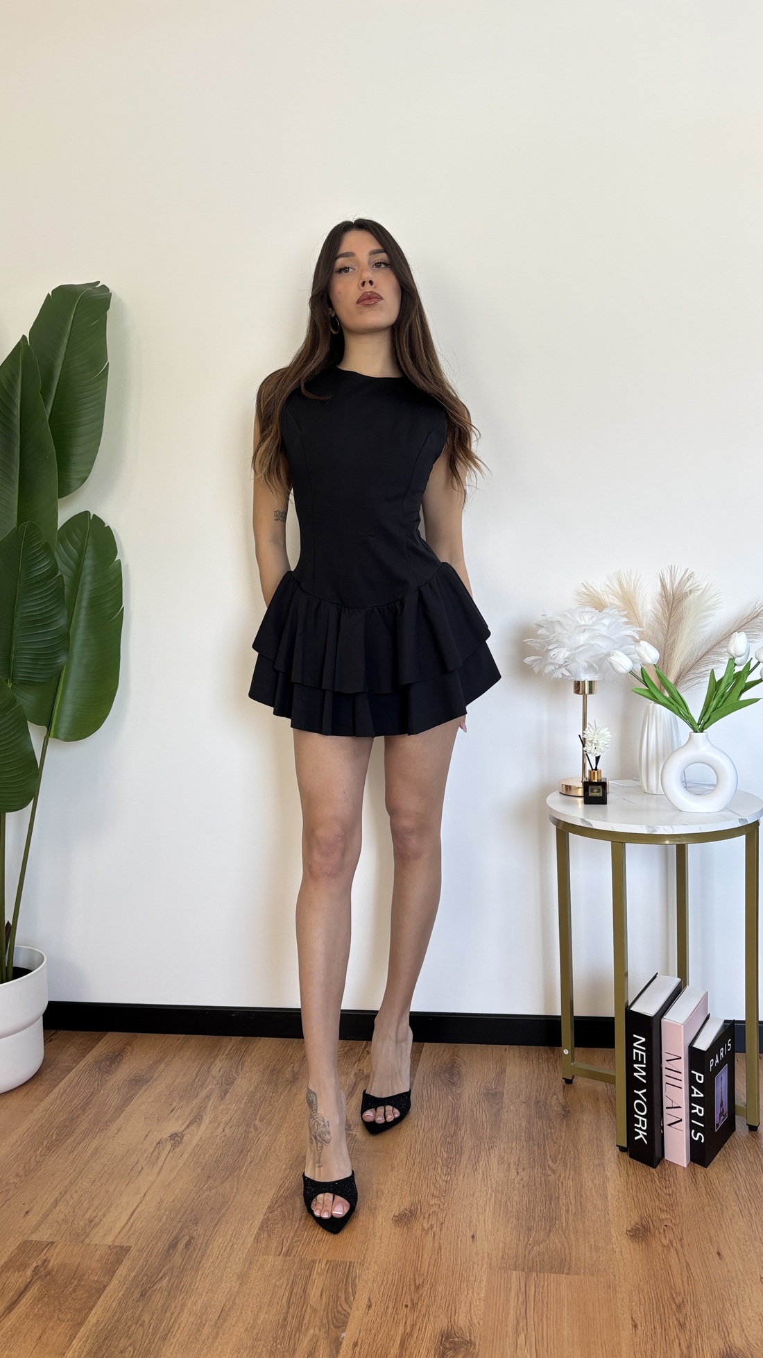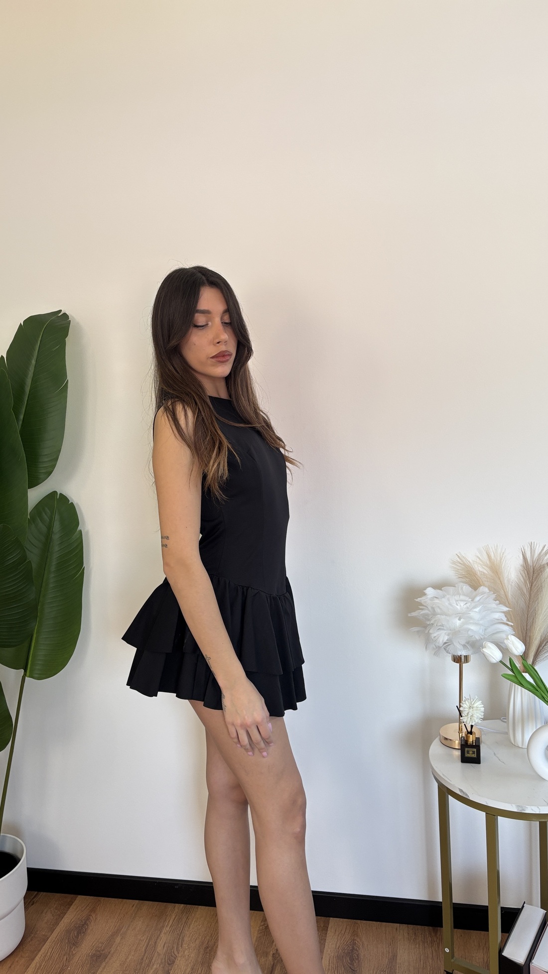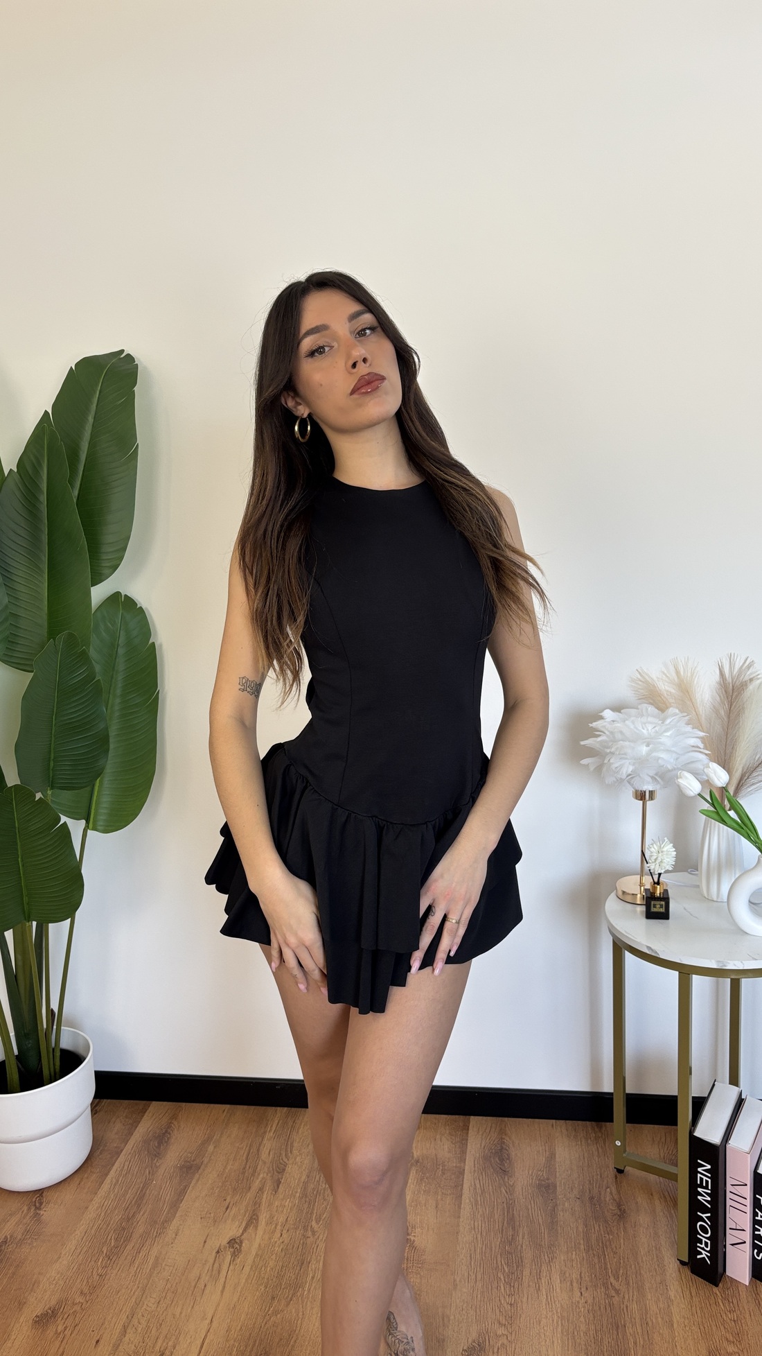 tubino smanicato con balza in fondo, e pantaloncino sotto.