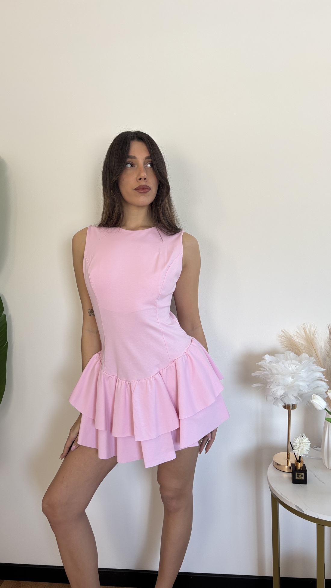 tubino smanicato con balza in fondo, e pantaloncino sotto.