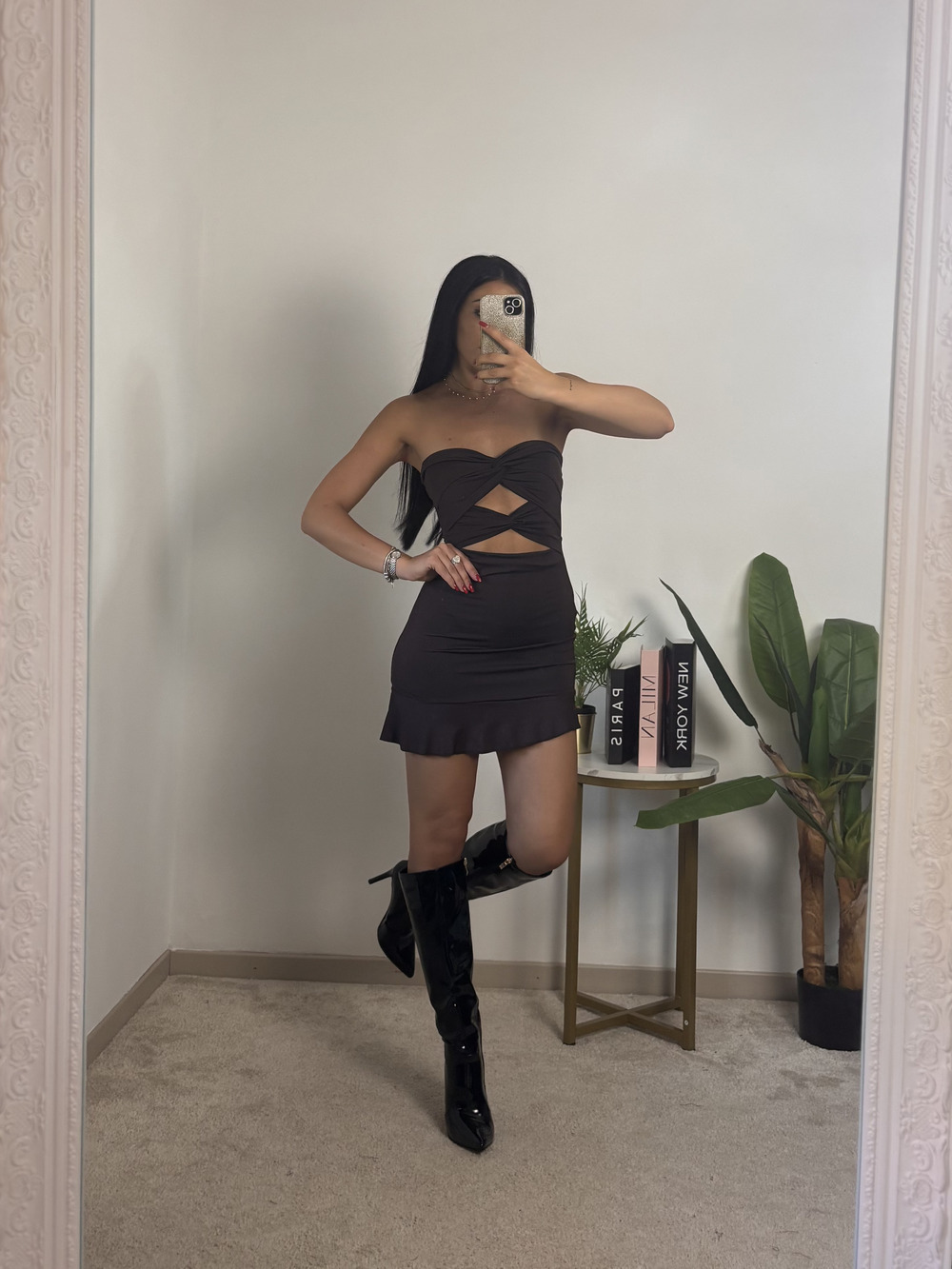 Tubino corto a fascia con doppio cut out e frappette in fondo.