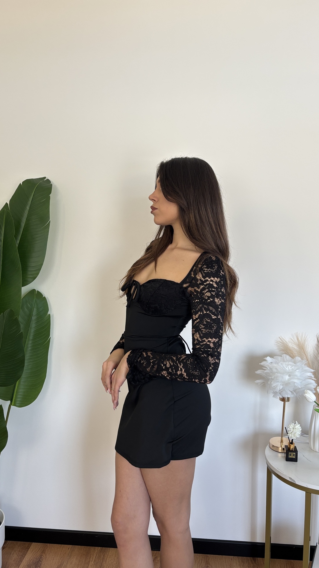 Tubino in lycra a pantaloncino con pizzo nelle maniche e lacci regolabili dietro.