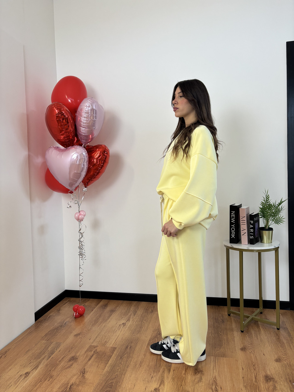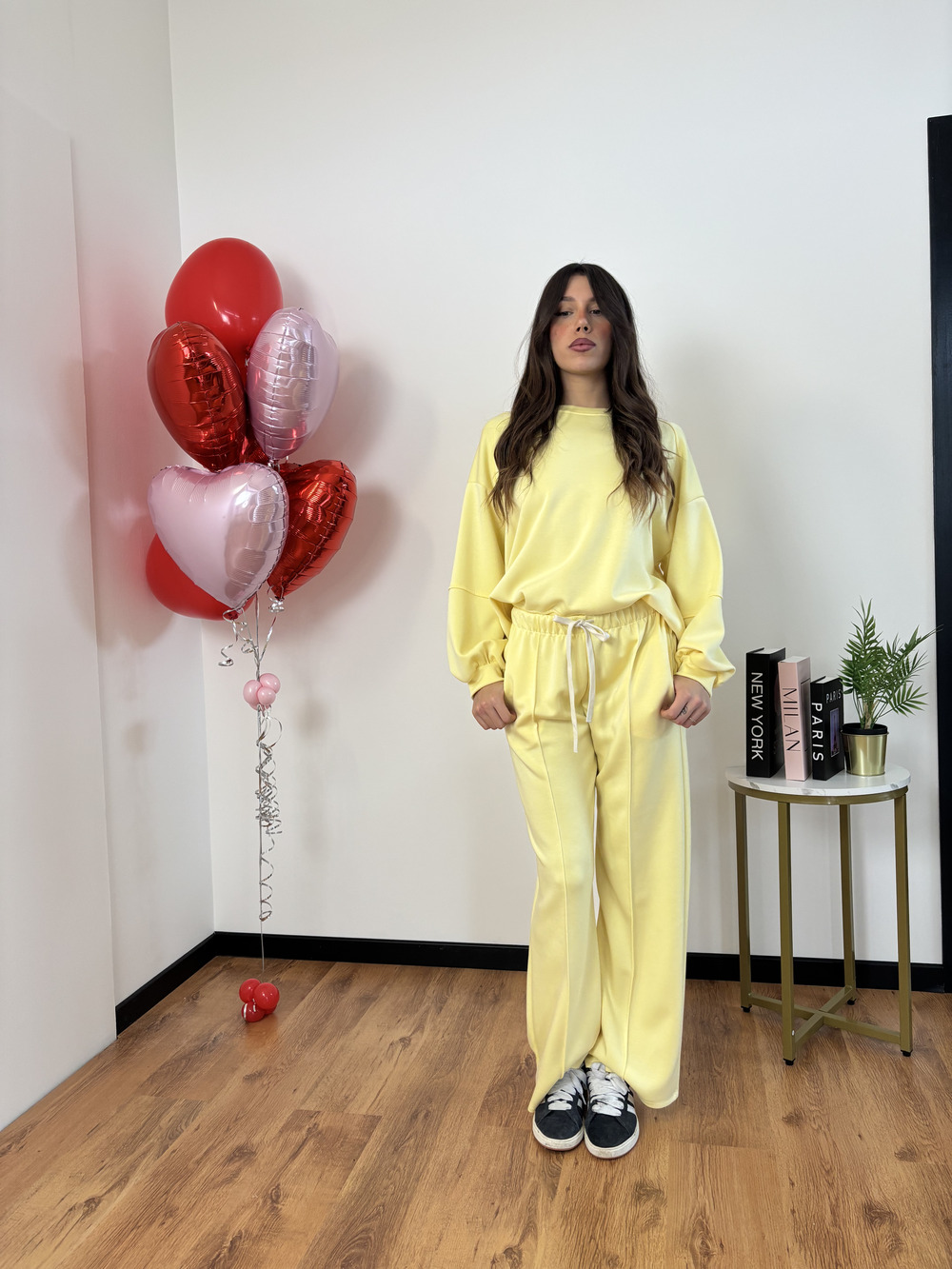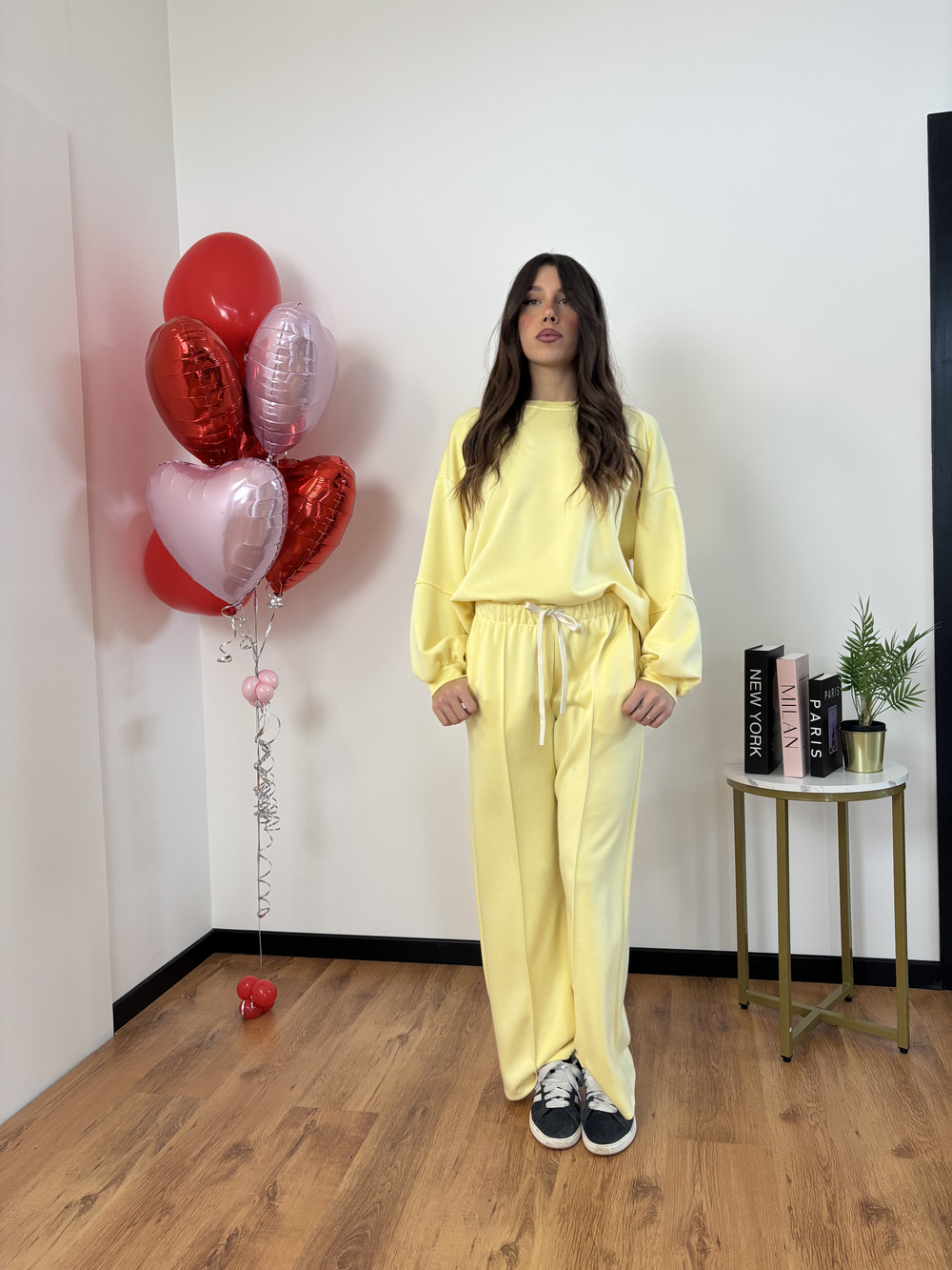 Felpa over size e pantalone a palazzo.