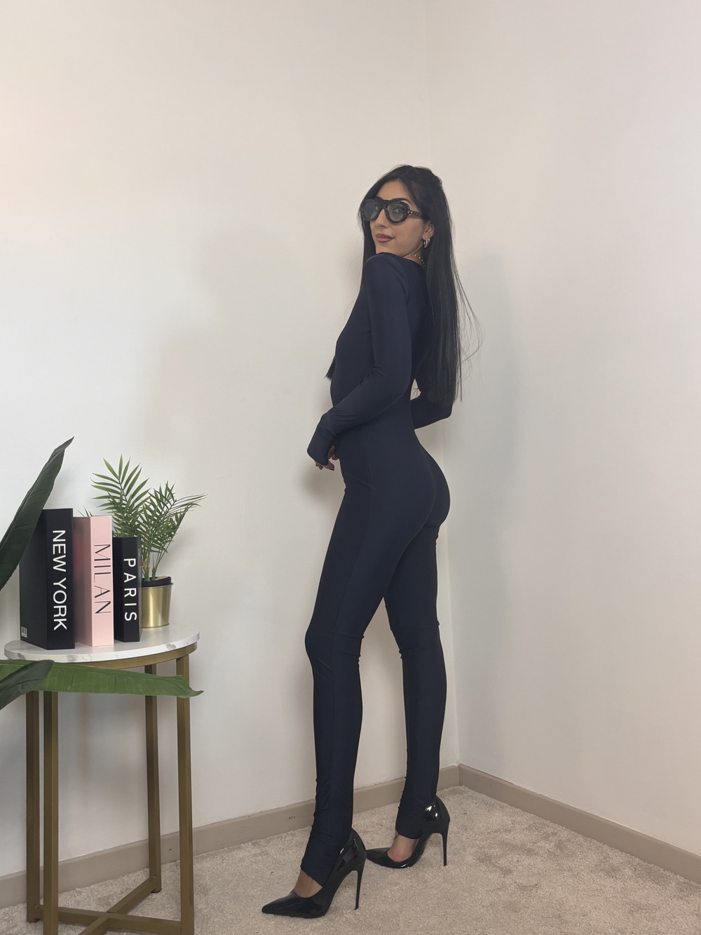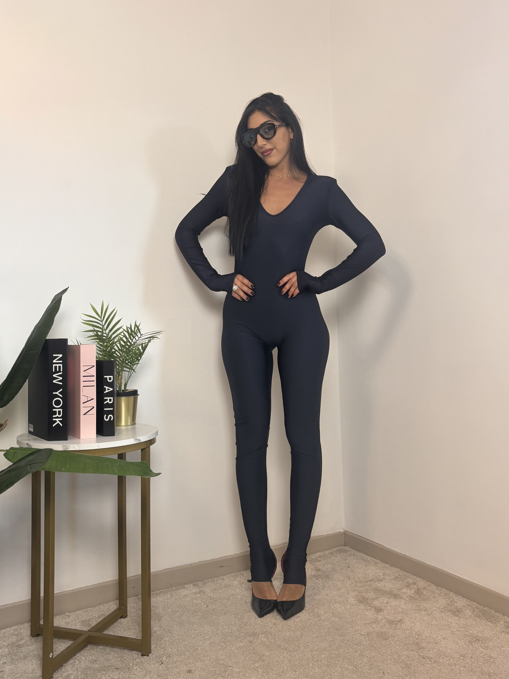 Tuta intera in lycra con scollo a V, elasticizzata.