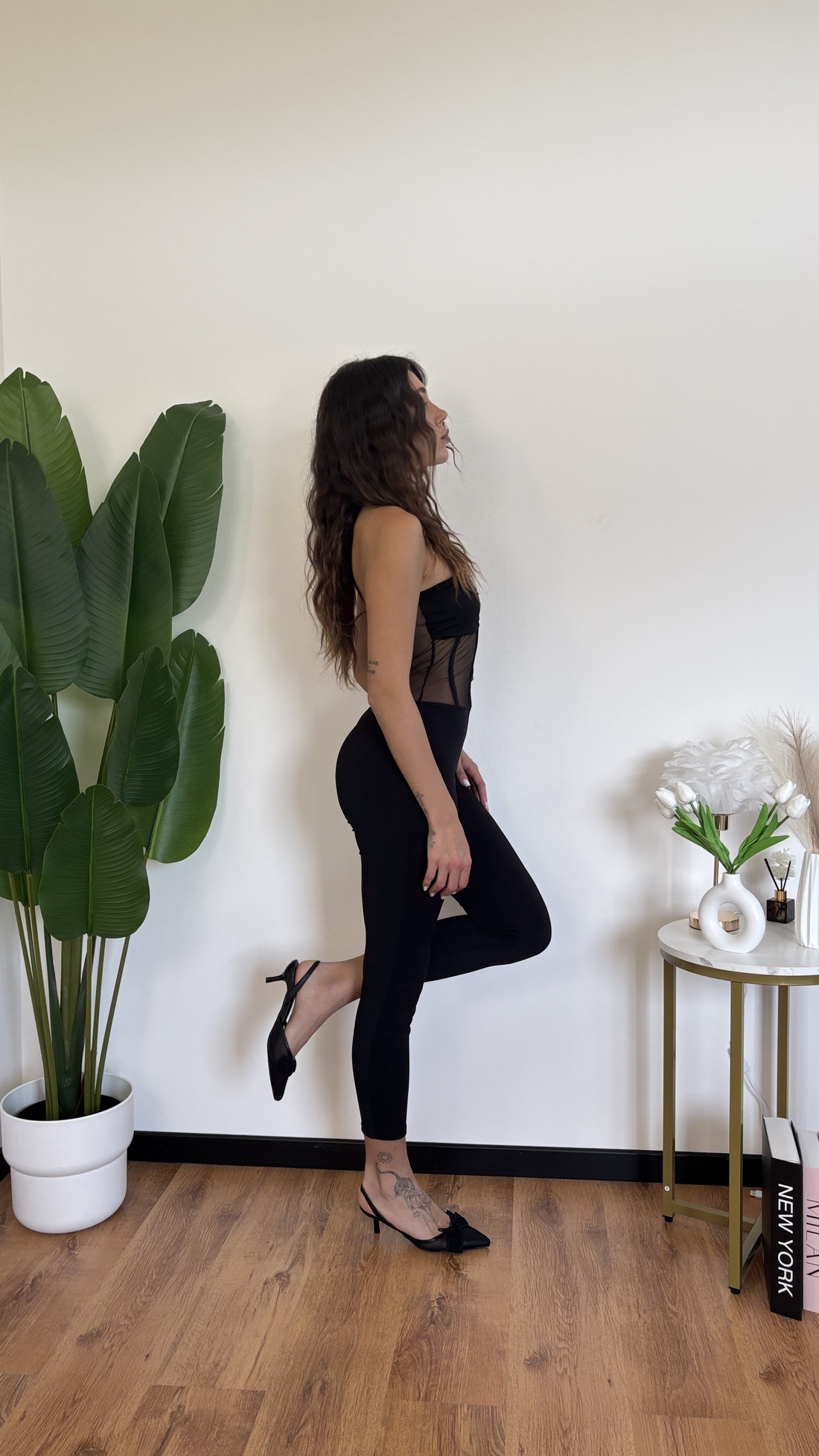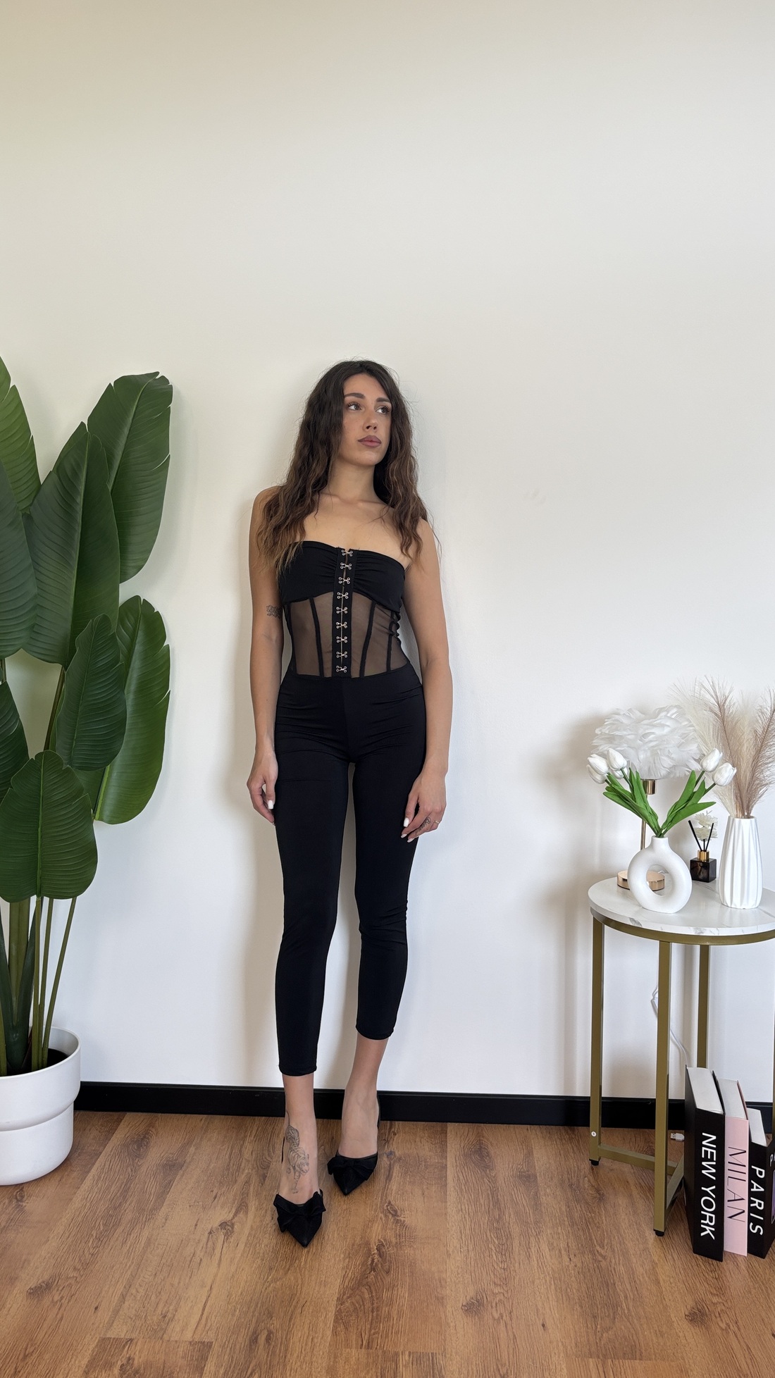 Tuta intera a fascia con gancini davanti.