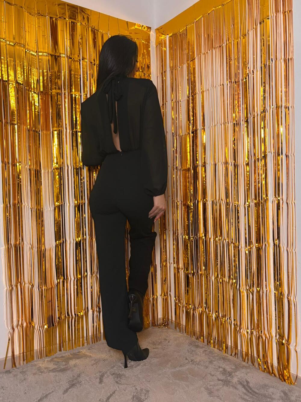 Tuta nera intera con camicia sopra allacciata dietro al collo.