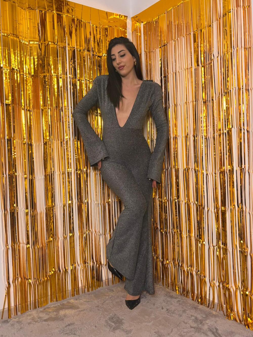 Tuta intera in lurex, a zampa con ampia scollatura a V e schiena nuda.