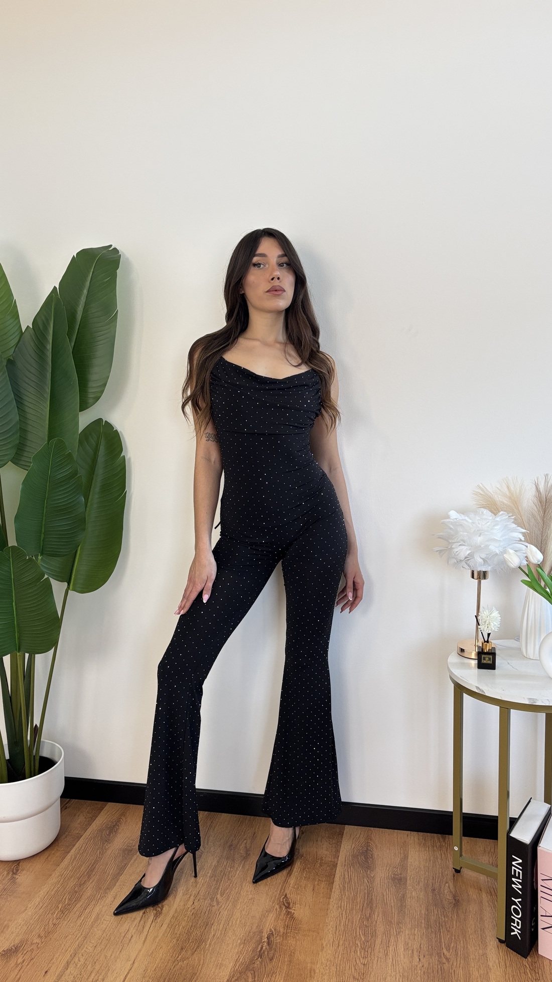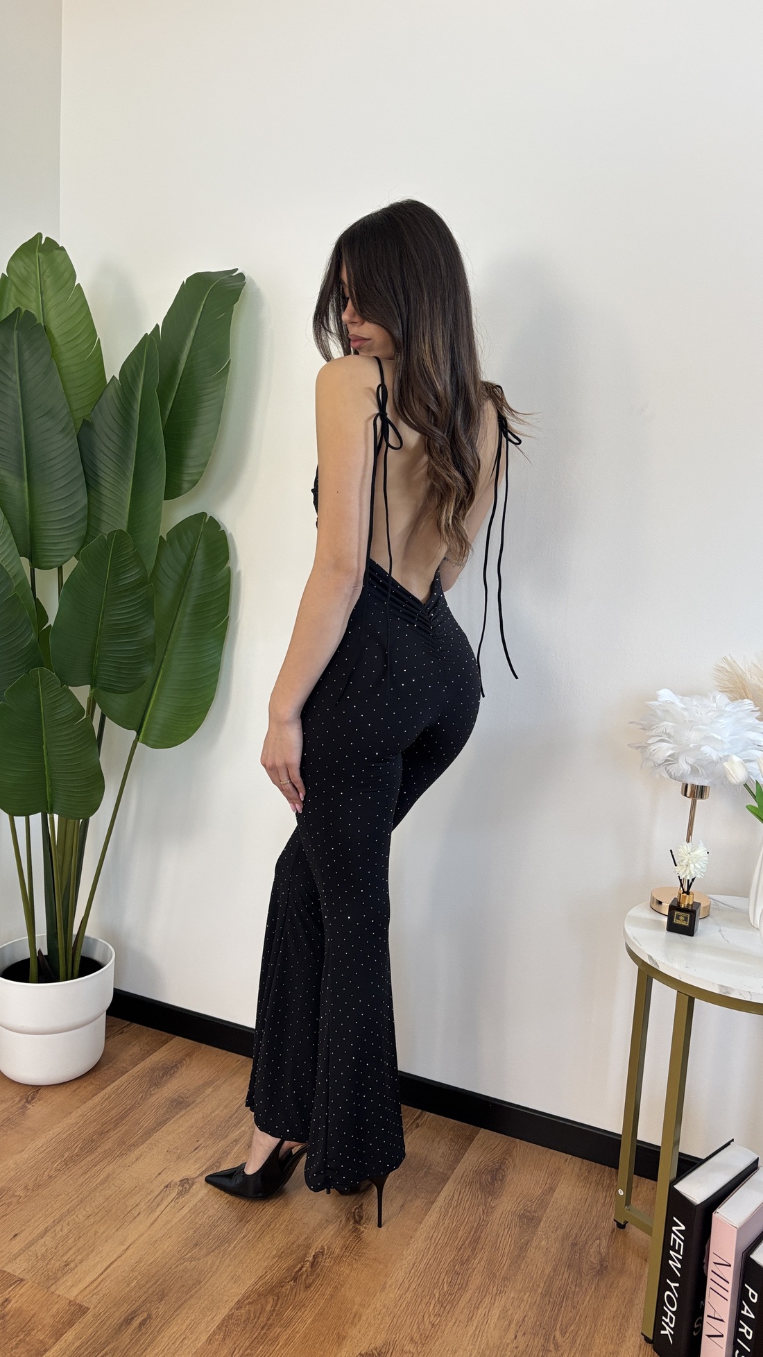 Tuta intera con strass, con schiena scoperta e spalline regolabile con lacci.