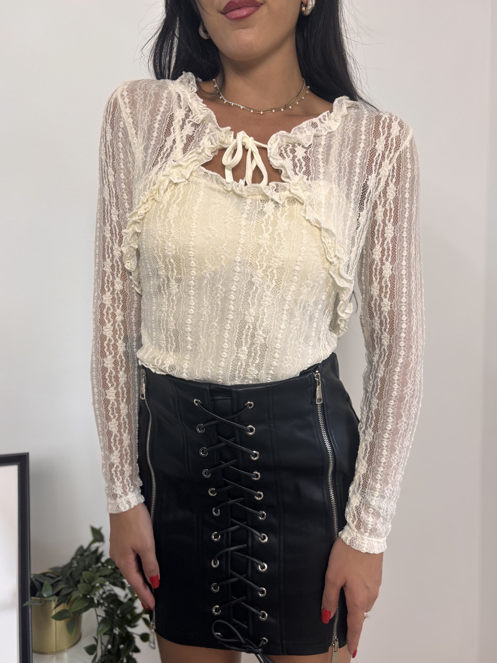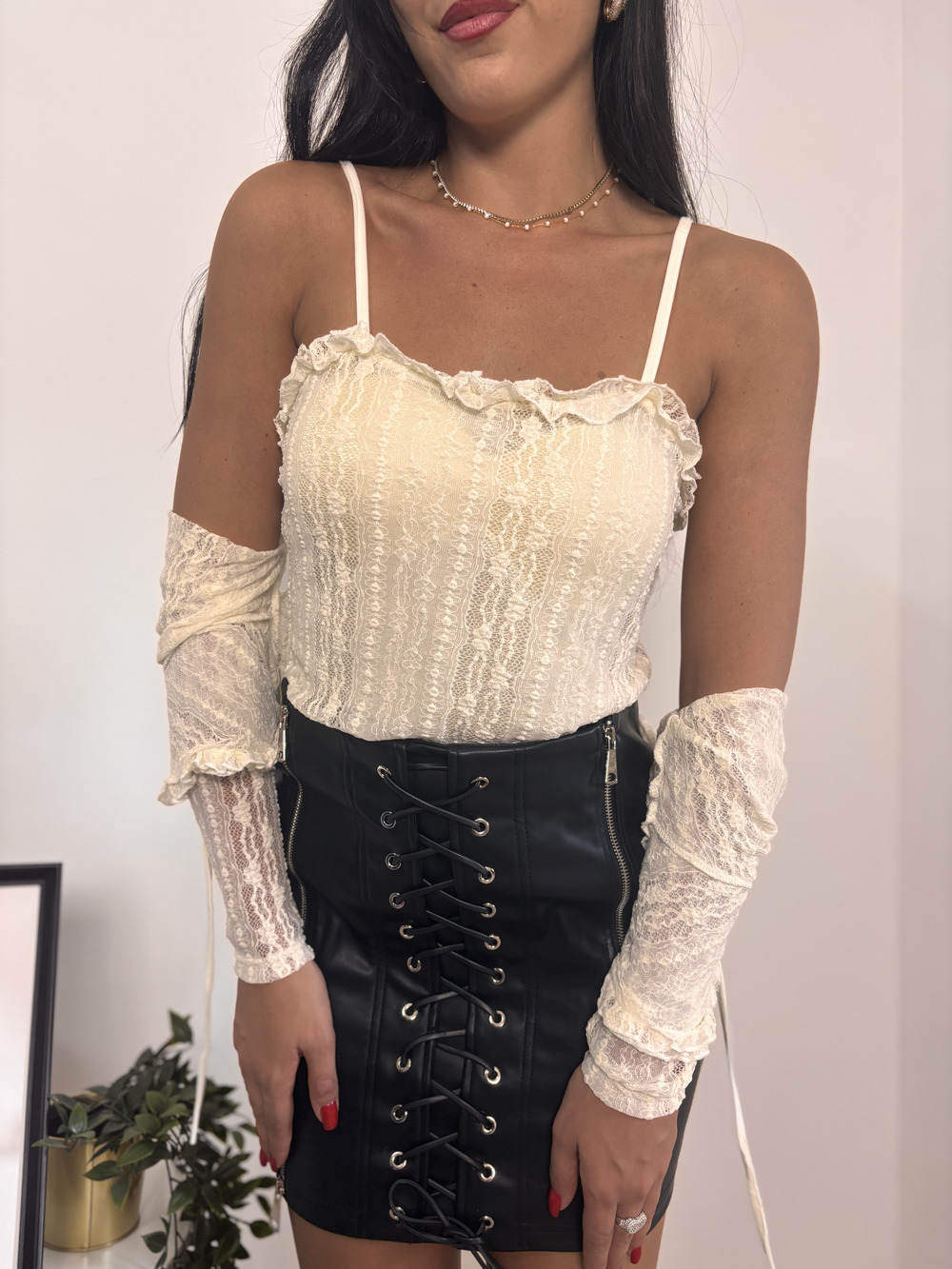 Corsetto in pizzo e coprispalle in pizzo.